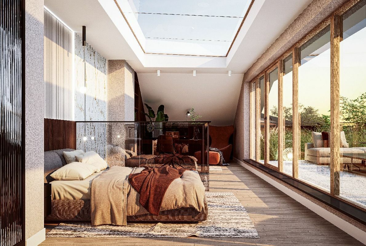 - Panoramiczne przeszklenia zapewniają bardzo dobre doświetlenie wnętrz oraz wzmacniają poczucie otwarcia na otoczenie.