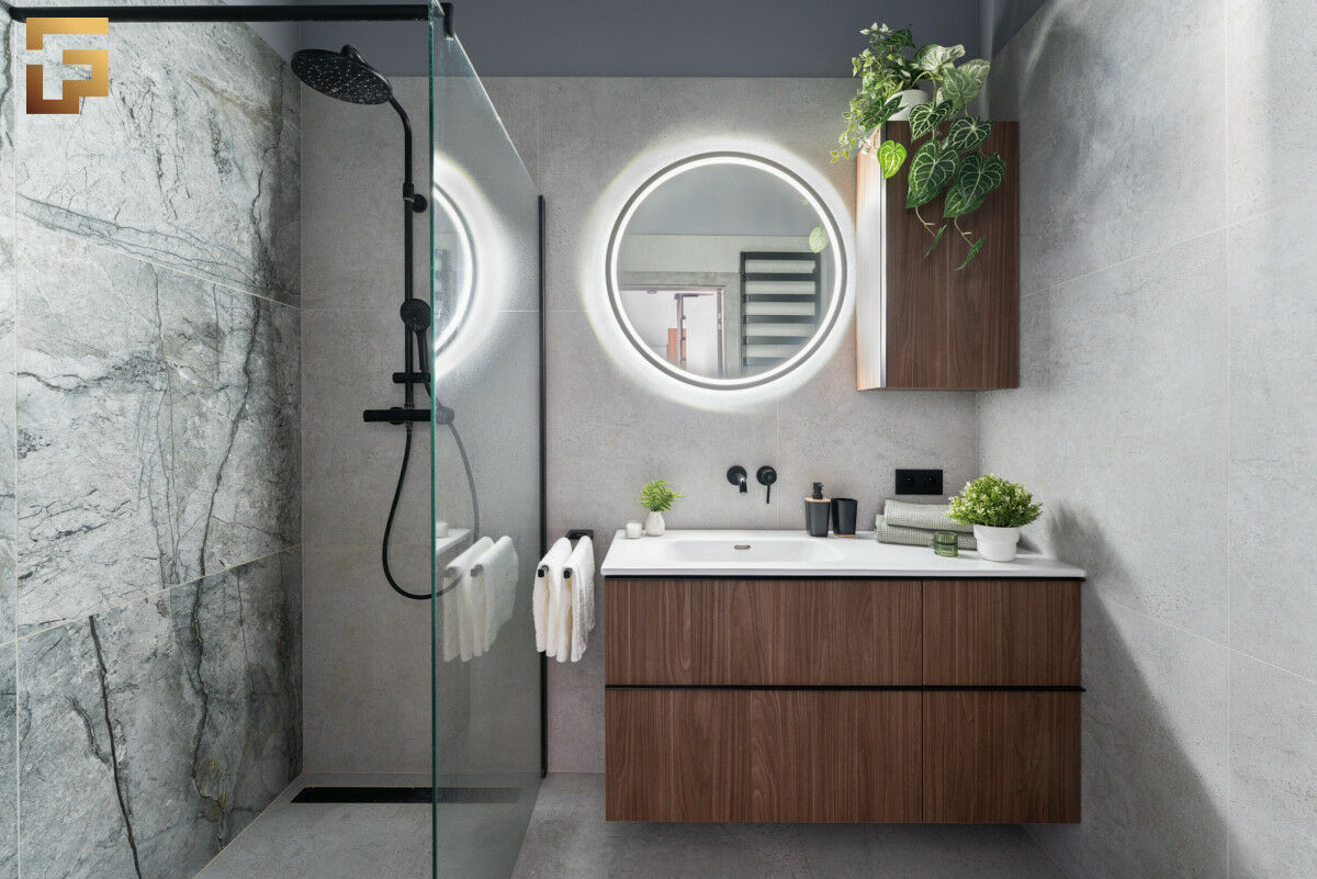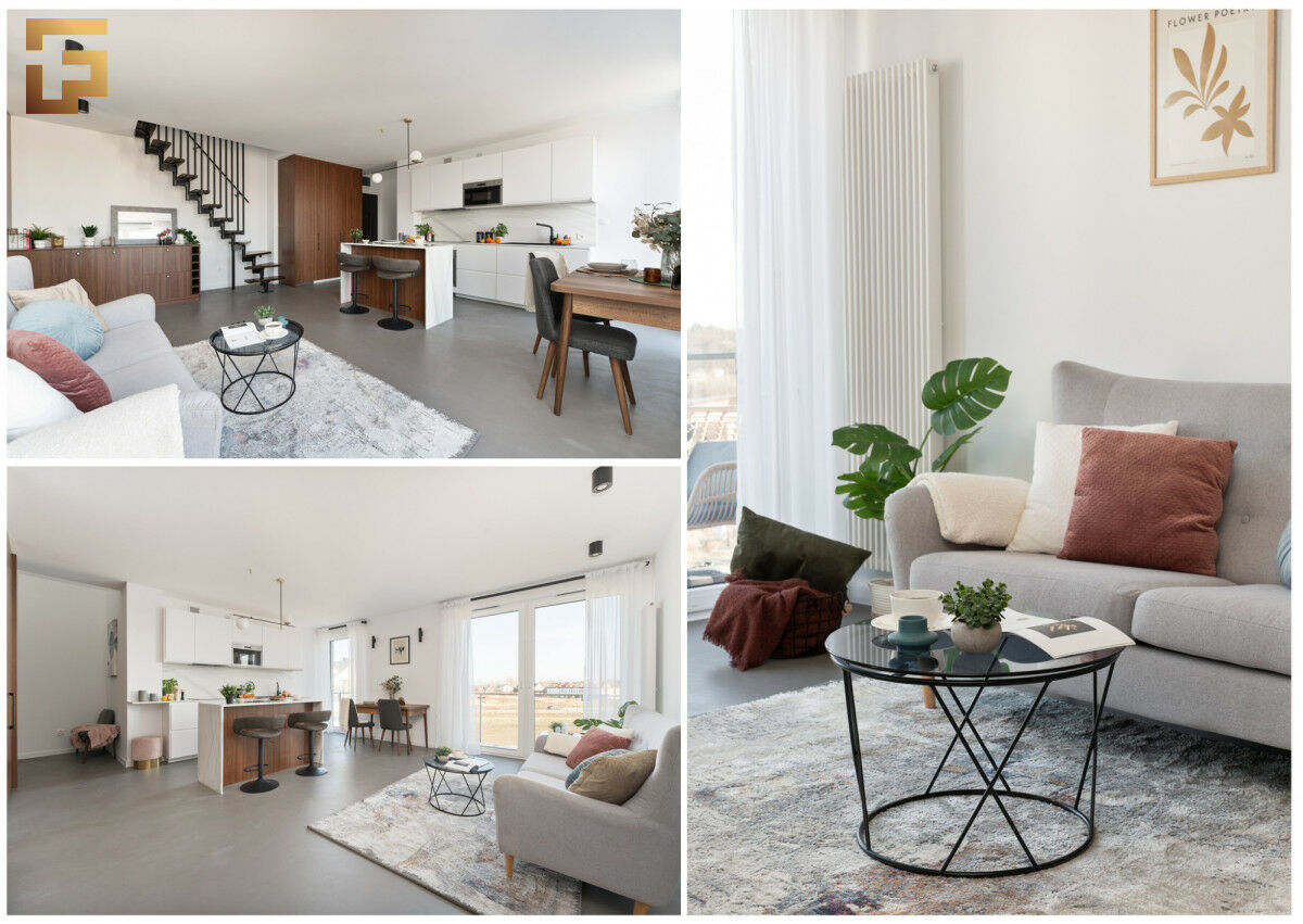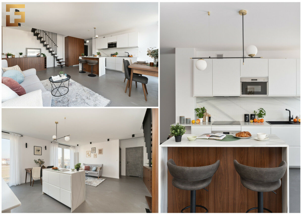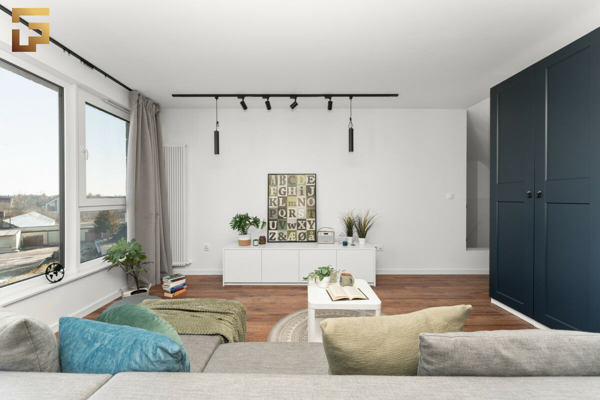 Przedstawiamy Państwu wyjątkowe dwupoziomowe mieszkanie. Staranne wykonanie jak i zaplanowana aranżacja prezentuje się elegancko i świeżo. Na podłodze mamy mikrocement dekoracyjny w kolorze light-grey, na antresoli zostały położone panele podłogowe w kolorze ciemnego brązu. Zabudowa salonowa oraz kuchenna została wykonana na zamówienie w kolorze orzechowym firmy Kronospan.