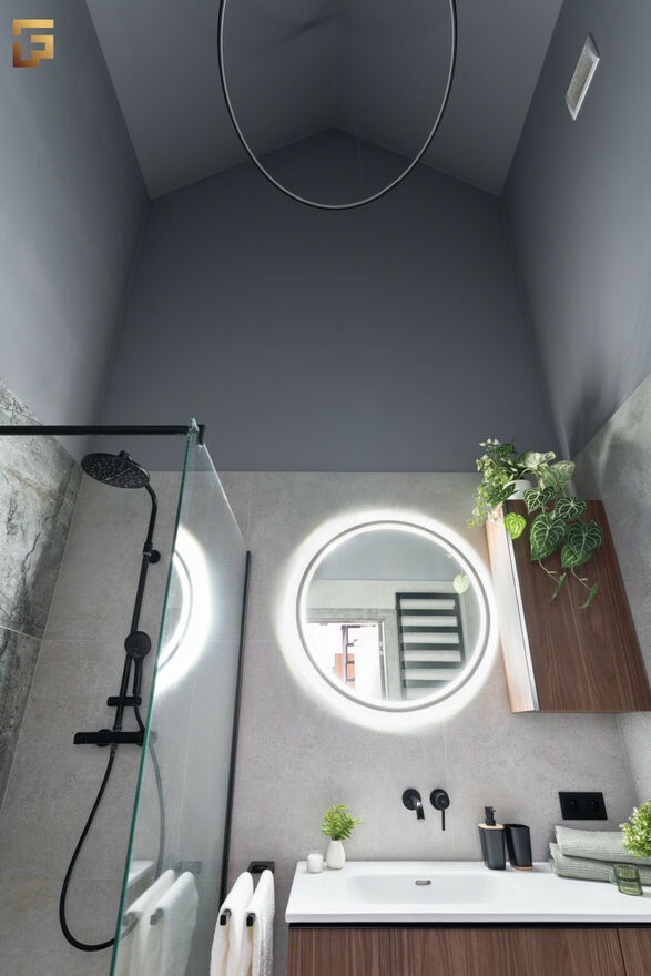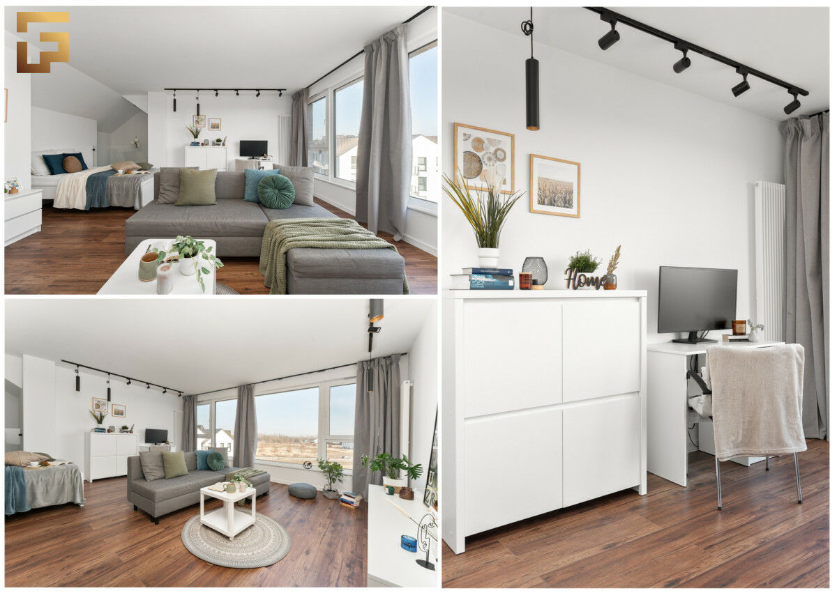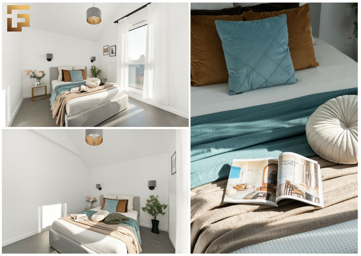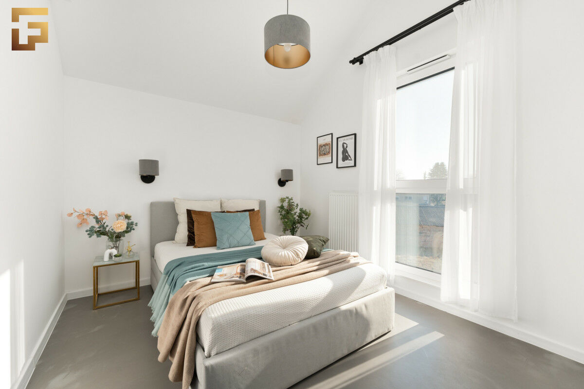 Na górze mieszkania została stworzona otwarta przestrzeń, która może służyć jako sypialnia, biuro lub pracownia. Pomieszczenie posiada ogromne okna na całej szerokości ściany, które zapewniają wyjątkowy dostęp do naturalnego światła i widoków. Wysokość pomieszczeń jest bardzo zróżnicowana, od 250 cm w niższych partiach, aż po 550 cm w części holu i łazienki, co dodaje przestronności i unikalnego charakteru wnętrzu. Całość mieszkania została zaprojektowana z myślą o komforcie i funkcjonalności.