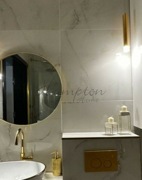 Kuchnia: W pełni wyposażona, nowoczesna, z najwyższej jakości sprzętem AGD. Czarne fronty szafek z białymi blatami i złotymi uchwytami tworzą luksusowy efekt. Łazienka: Jasna i funkcjonalna. Biało-złote wykończenie nadaje jej elegancji i stylu. Wygodna kabina prysznicowa, wolno stojąca wanna, designerska umywalka oraz najwyższej jakości armatura.