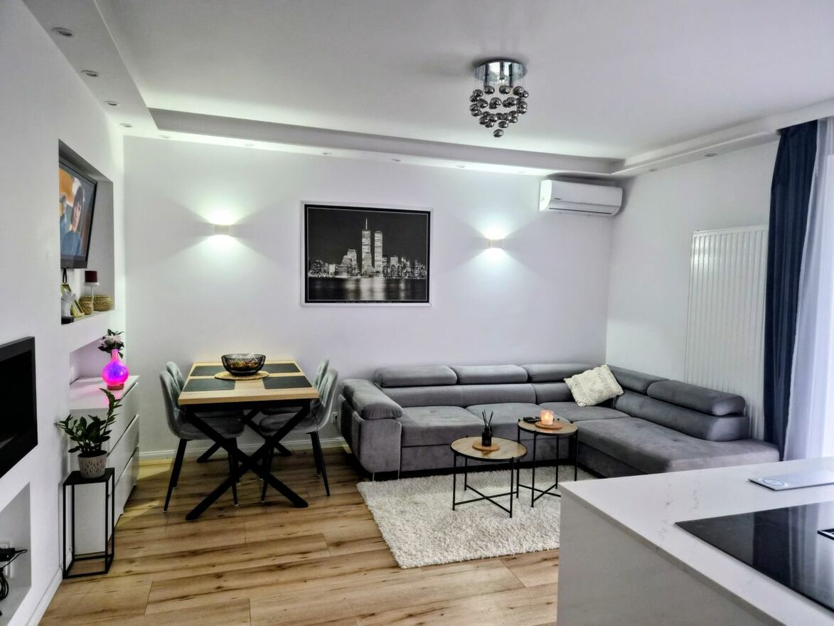3-pokojowe mieszkanie wykończone w wysokim standardzie, z ogródkiem, klimatyzacją , ciekawie zaaranżowaną łazienką i otwartą kuchnią.Piękna zielona okolica i cisza to ważny atut tego miejsca.