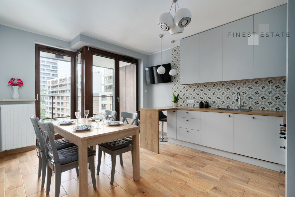 Funkcjonalnego aneksu kuchennego z wyspą oraz jadalnią: Kuchnia w zabudowie daje wiele miejsca do przechowywania, długi blat wraz z wyspą zapewnia przestrzeń do kulinarnych przygód. Kuchnia została w pełni wyposażona w niezbędny sprzęt kuchenny AGD tj. lodówka wraz z zamrażarką w zabudowie, piekarnik, płyta indykcyjna, okap oraz zmywarka. Przy wyspie znajdują się dwa hokery. W przestrzeni znalazł miejsce duży stół z 4 krzesłami oraz TV. Przestrzeń jest bardzo jasna z uwagi na duże okna o ekspozycji zachodniej z wyjściem na loggię.