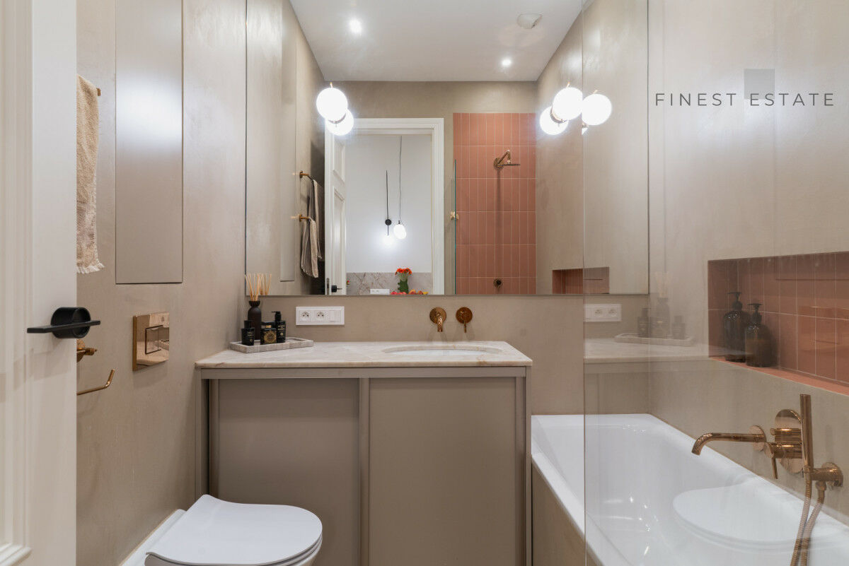 Łazienka - 4,6 m² - elegancko wykończona, z wanną i prysznicem, armaturą w złotym wykończeniu i praktycznymi rozwiązaniami do przechowywania oraz systemem podgrzewanej podłogi.
