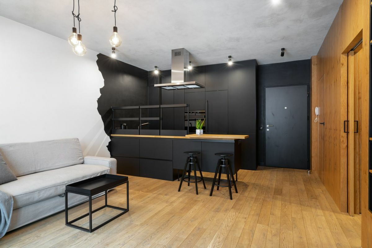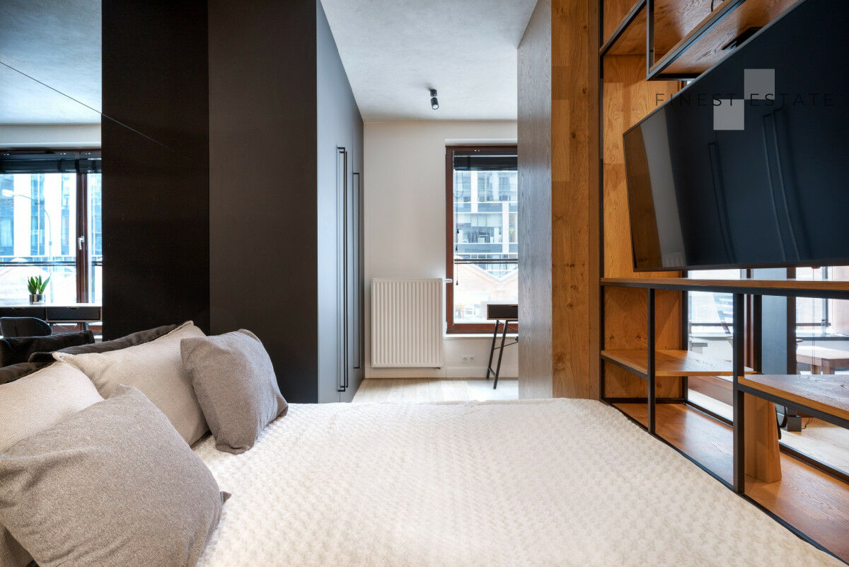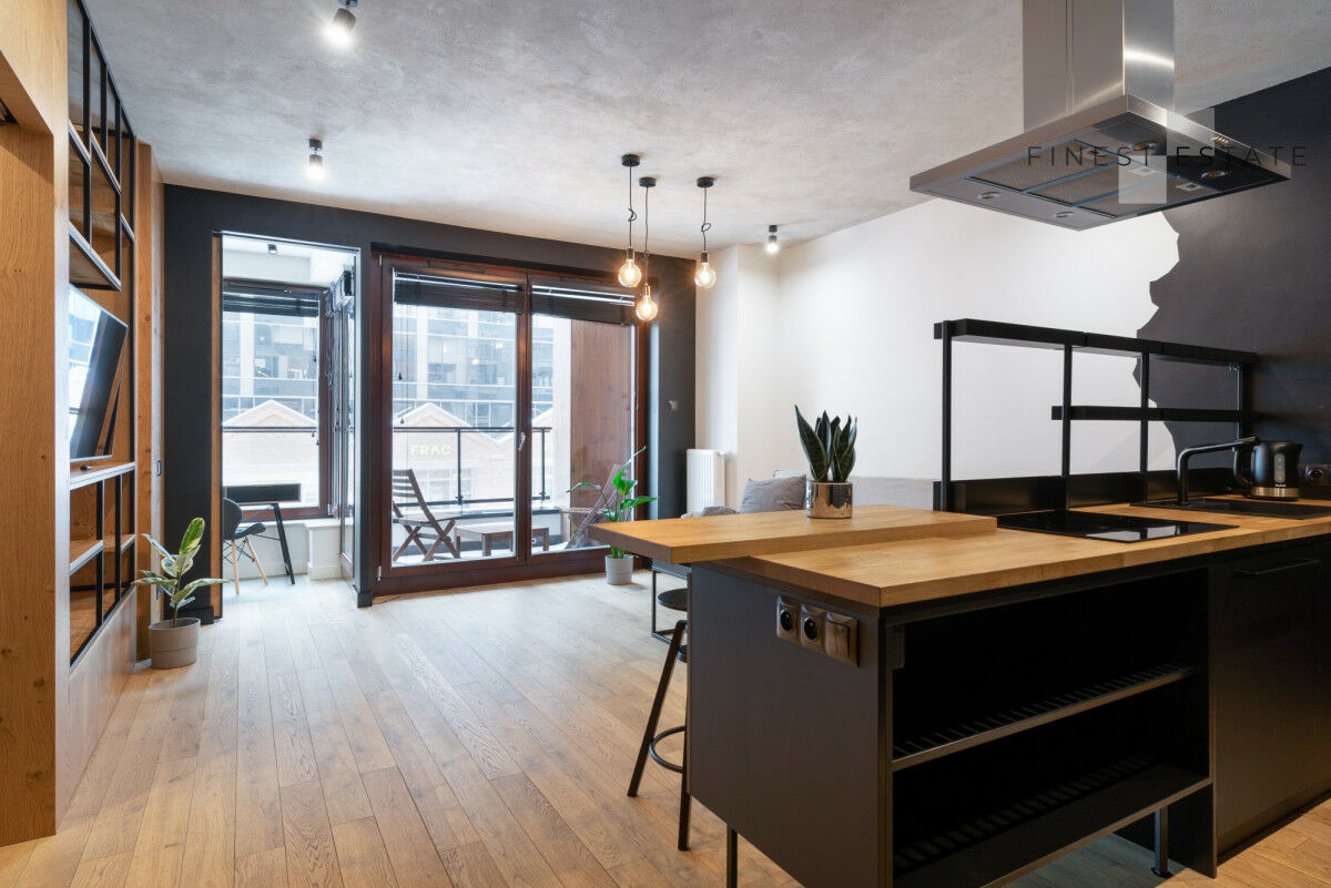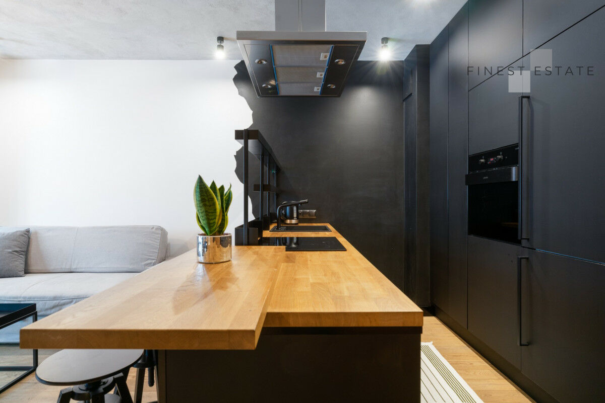 Piękna, ciemna zabudowa aneksu kuchennego wykonana została z wysokiej jakości płyty w macie, a wszystko zostało podkreślone drewnopodobnymi akcentami. Liczne szuflady oraz szafki z systemem push zapewniają dużo miejsca do przechowywania. Funkcjonalności kuchni dopełniają nowe sprzęty AGD: piekarnik, zmywarka, pralka, płyta indukcyjna, okap oraz lodówka w zabudowie. Kuchnia posiada pełne wyposażenie.W przestrzeni znalazło się miejsce dla wyspy z hookerami.
