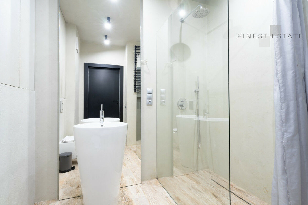 Niezwykle elegancka i jasna łazienka z dużym prysznicem została wyposażona w wolnostojąca umywalkę, zabudowę stwarzającą dodatkowe miejsce do przechowywania.