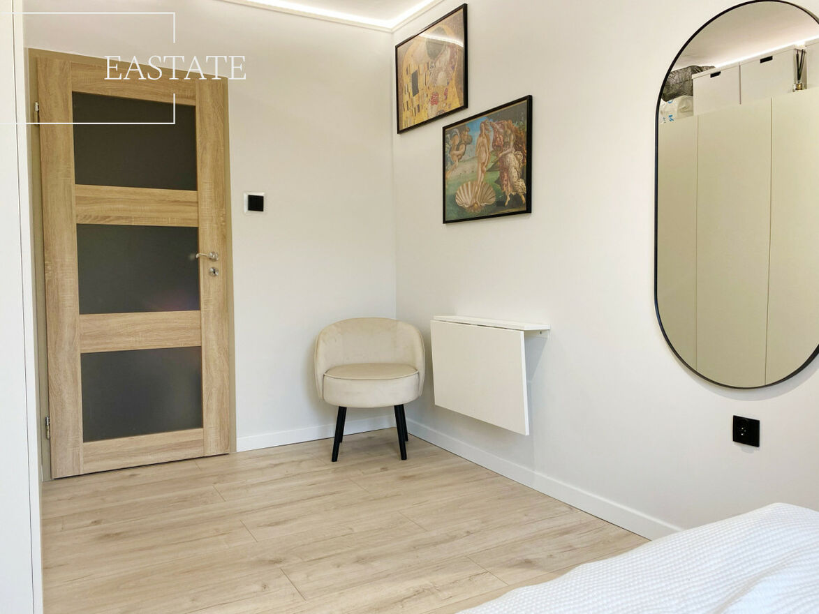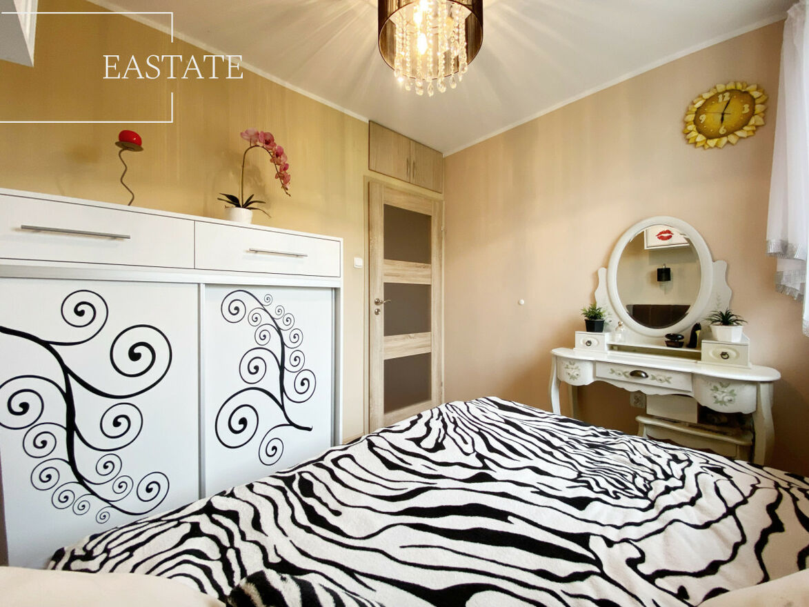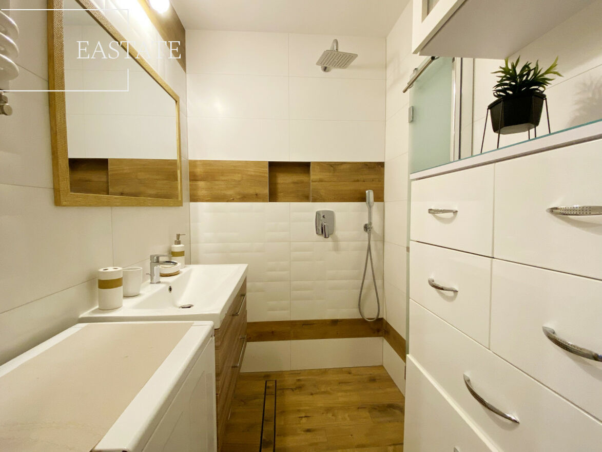 Całe mieszkanie jest w pełni umeblowane i wyposażone. W kuchni lodówko-zamrażarka, piekarnik, kuchenka, pralka i zmywarka. Ponadto w salonie znajduje się szafa wnękowa oraz 2 wygodne kanapy a także stół z krzesłami. W pierwszej sypialni łóżko oraz szafa, w drugiej komoda, szafa oraz podwójne łóżko, w trzeciej natomiast toaletka, komoda i podwójne łóżko.