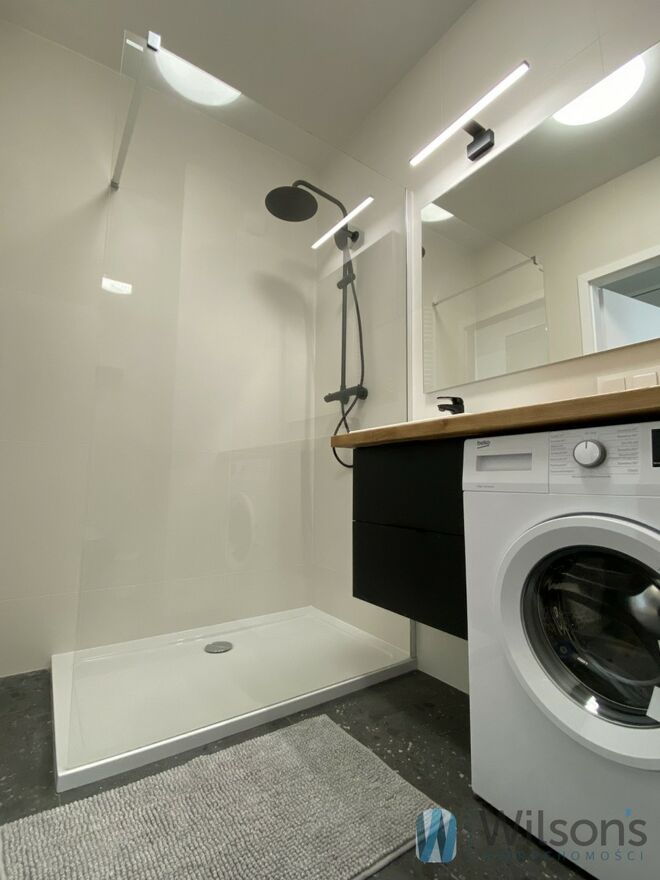 - Nowocześnie urządzona łazienka z prysznicem i pralką.