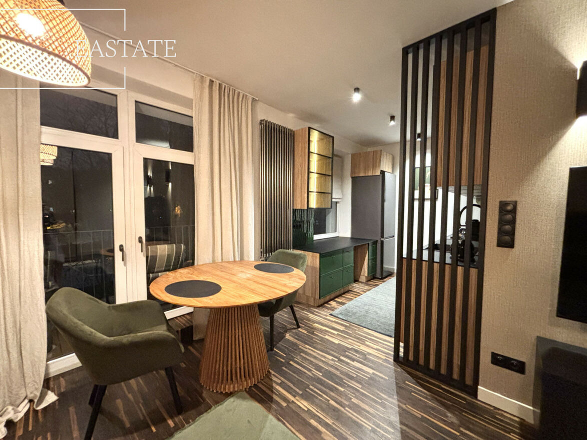 - Salon z aneksem kuchennym oraz wyjściem na balkon.