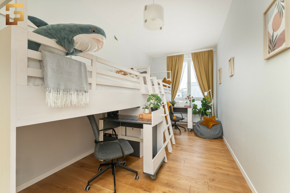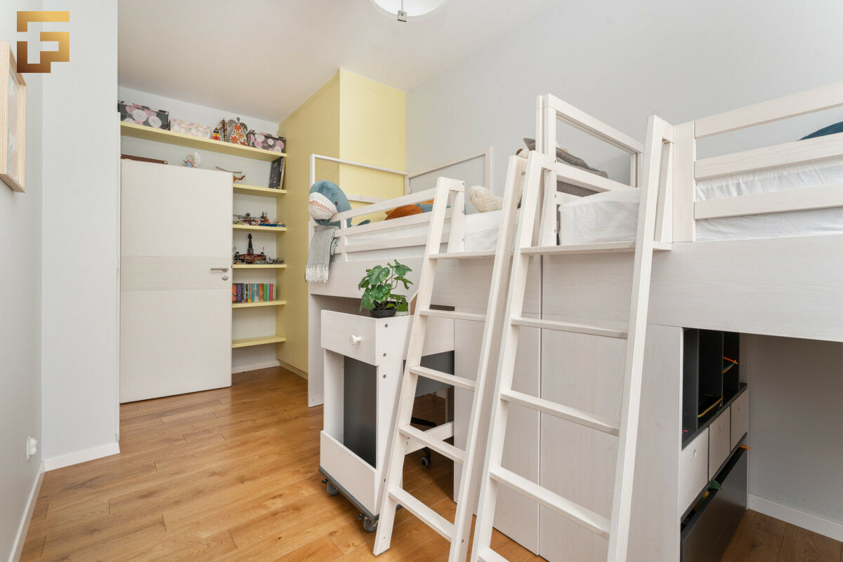 Drugi pokój, przeznaczony obecnie jako dziecięcy, został wyposażony w dwa łóżka piętrowe z wysuwanymi biurkami na kółkach, które można swobodnie chować pod łóżkami. To rozwiązanie, które pozwala łatwo utrzymać porządek i stworzyć dużą, otwartą przestrzeń do zabawy.