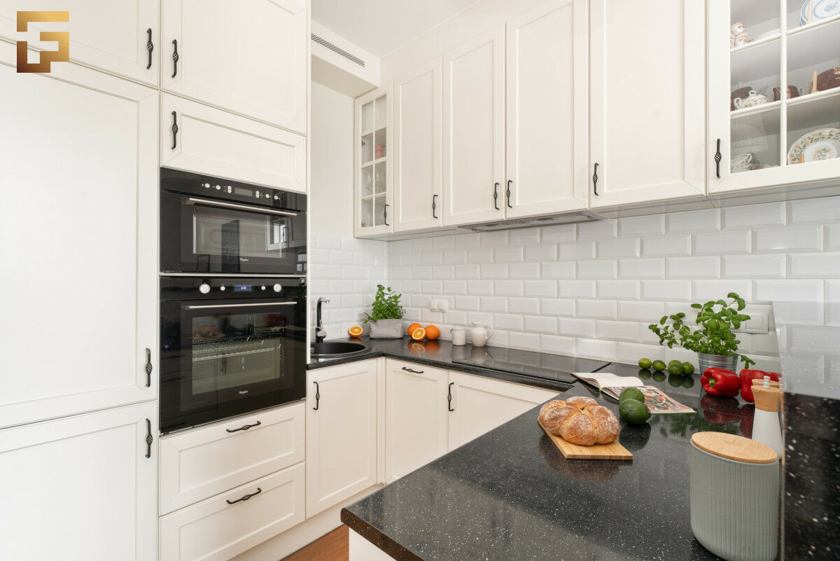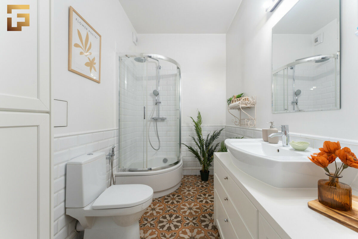Łazienka została wyposażona w głęboką zabudowę stolarską z ukrytą pralką, zachowuje wygodne proporcje i prezentuje świeży, estetyczny wygląd.