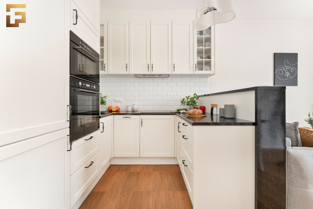 Kuchnia jest jasna, doświetlona, wyposażona we wszystkie niezbędne sprzęty AGD oraz odpowiednio duży, wygodny blat roboczy.