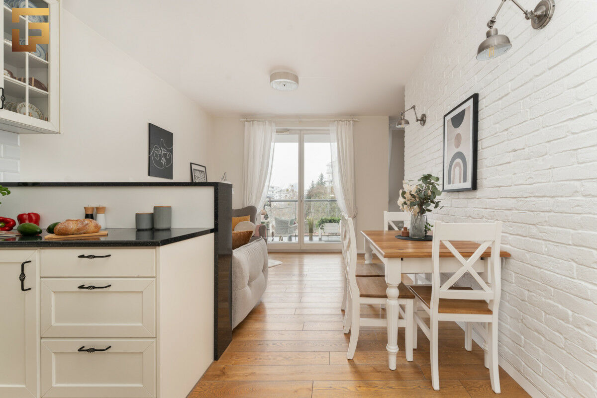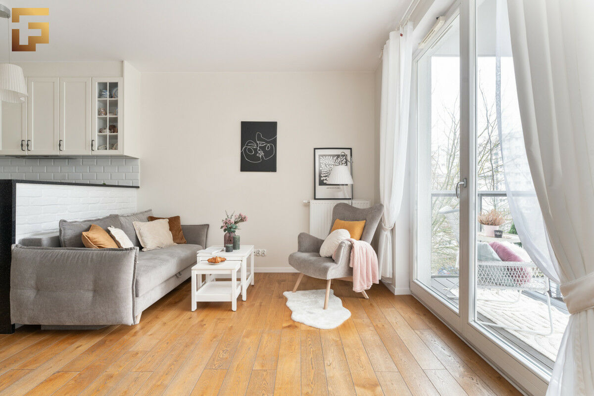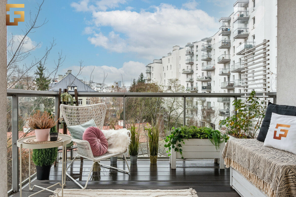 Salon, mimo kompaktowych proporcji, jest zaskakująco ustawny i pojemny dzięki przemyślanemu układowi mebli. Wyjście prowadzi na częściowo osłonięty balkon o powierzchni 5,75 m², skierowany na południowy wschód, co zapewnia świetne nasłonecznienie i jednocześnie ograniczoną ekspozycję na sąsiednie balkony.