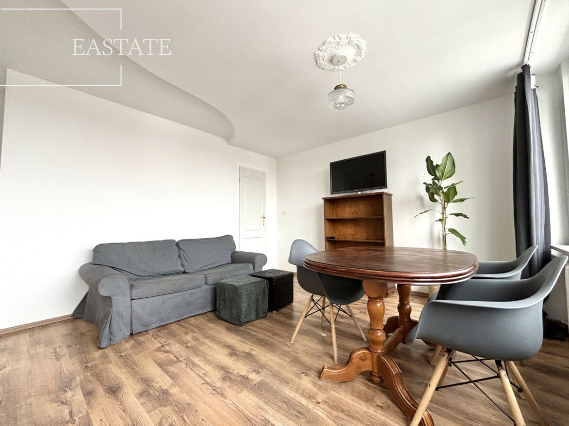 - Salon z aneksem kuchennym oraz wyjściem na balkon.