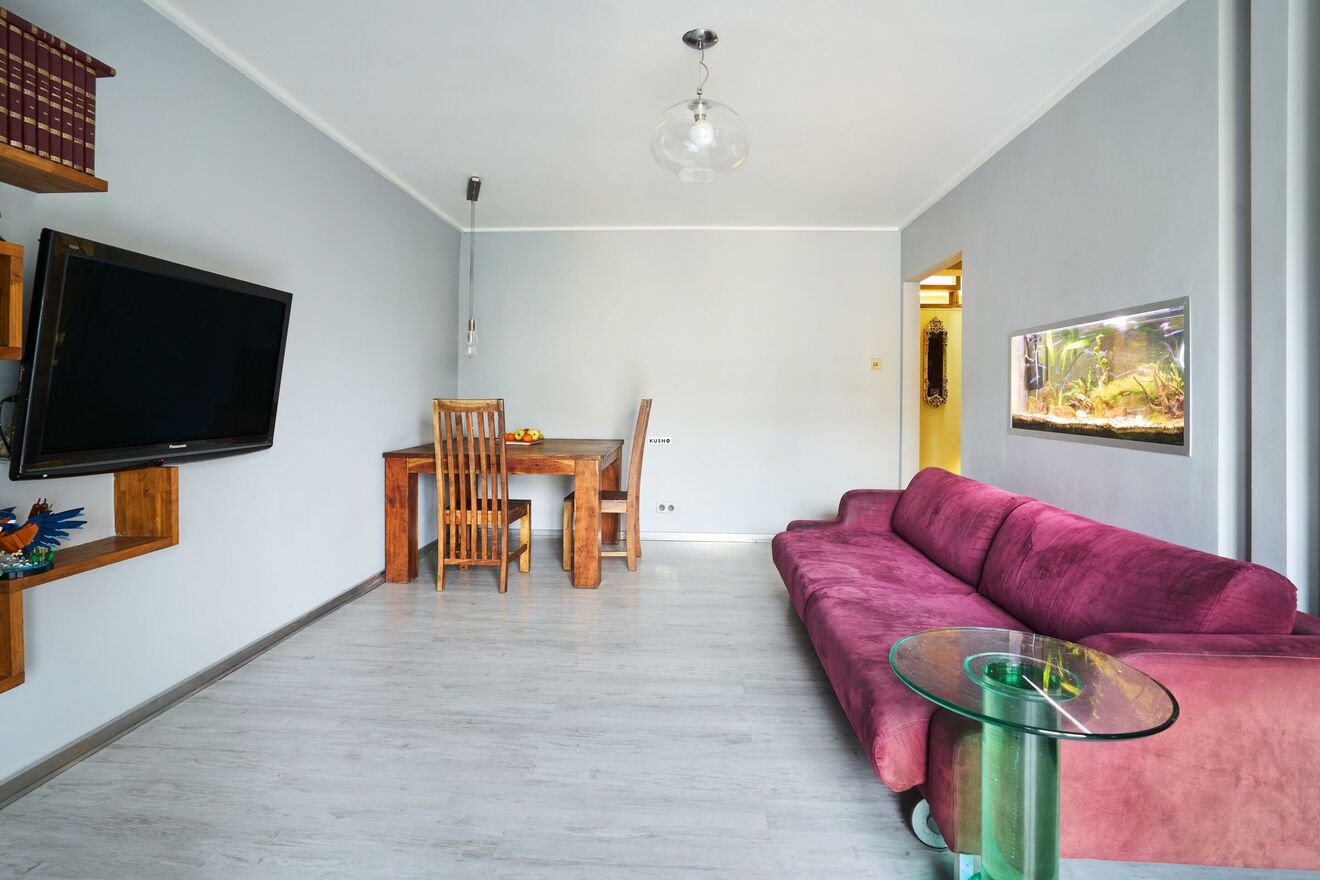 The apartment is located in a four-storey, brick building in very good technical condition.Common areas are clean and renovated, and the estate is well-kept, quiet, and orderly, with a friendly residential atmosphere.