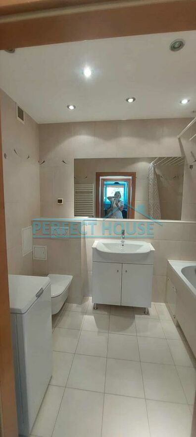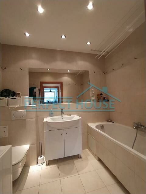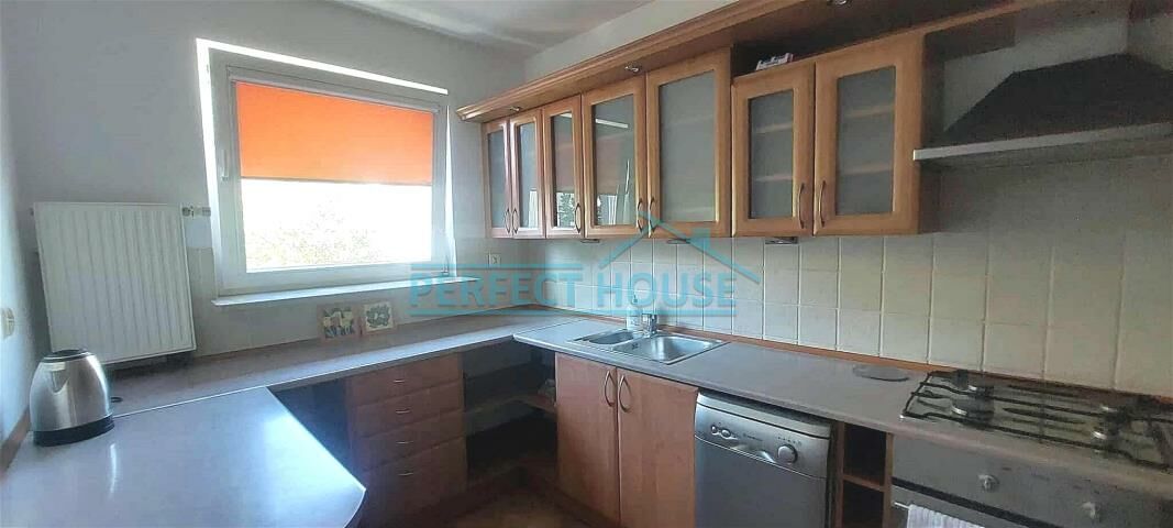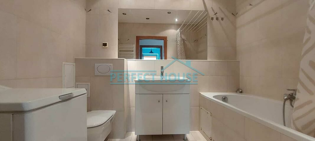 Wygodna kuchnia 8 m2, kuchenka gazowa, piekarnik elektryczny, zmywarka, lodówka.Przestronna łazienka z dużym lustrem, szafką pod dużą umywalką, wanną, pralką i WC.
