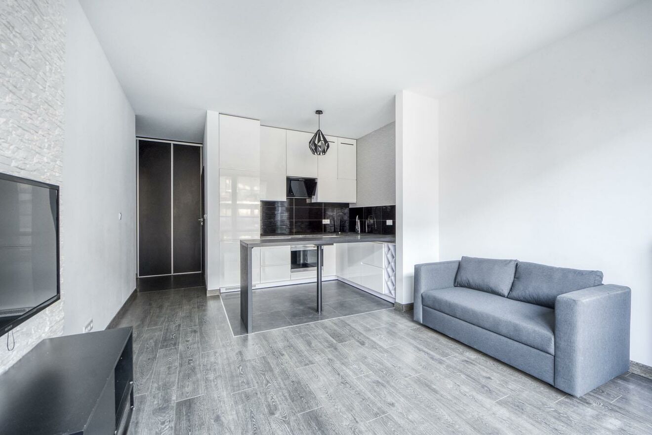 Centralnym punktem mieszkania jest przestronny salon z aneksem kuchennym z bezpośrednim wyjściem na dużą loggię.