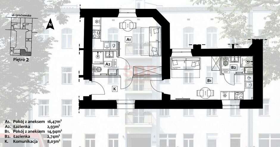 - 2 mieszkanie (pokój z aneksem kuchennym, sypialnia, łazienka z WC)