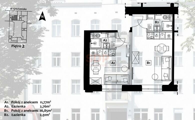 - 2 mieszkanie (pokój z aneksem kuchennym, sypialnia, łazienka z WC)
