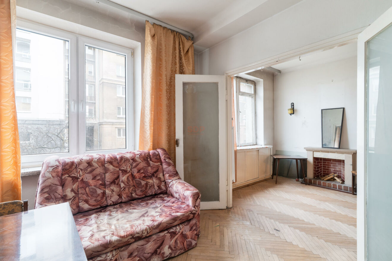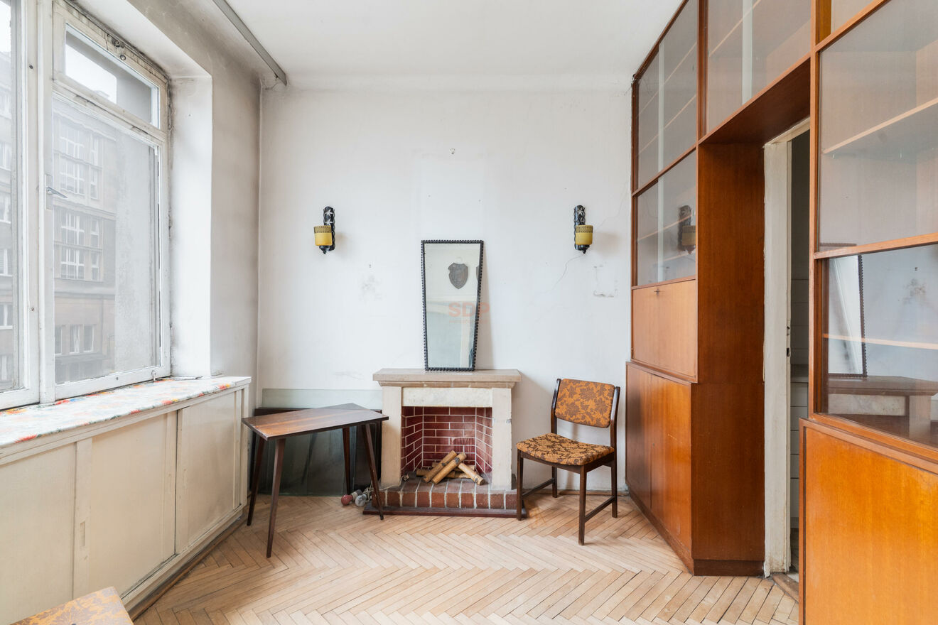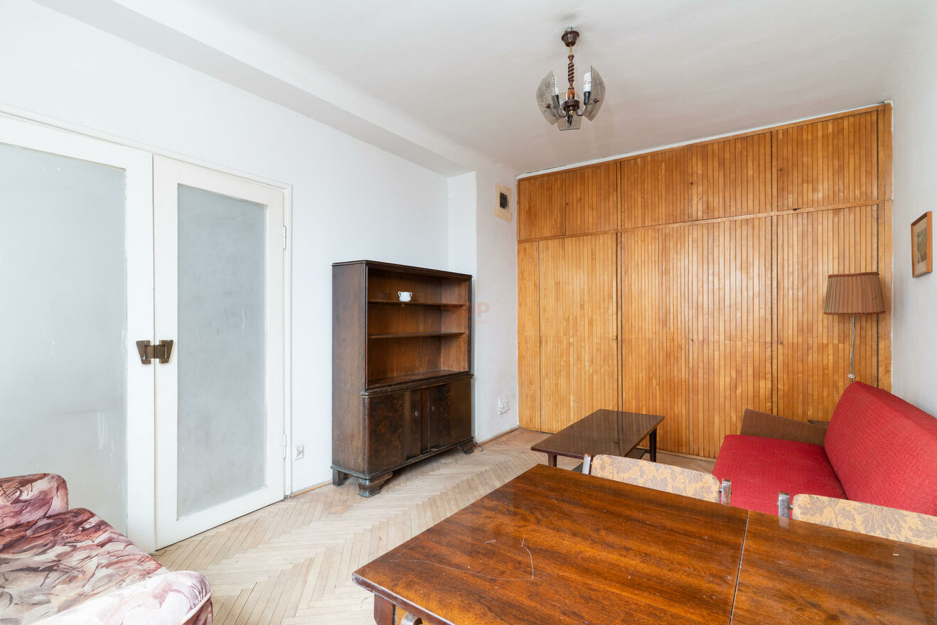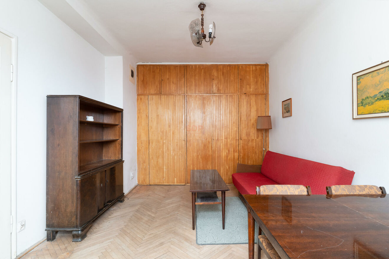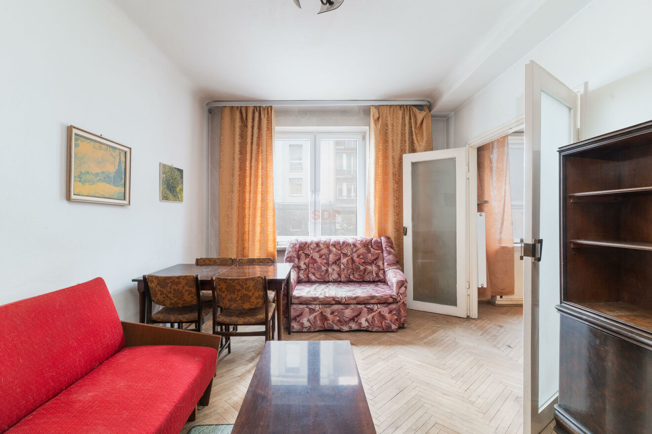 Lokal przeznaczony do remontu, daje duże możliwości aranżacyjne według własnego pomysłu. Obecnie składa się z przestronnego salonu, sypialni, ciemnej kuchni oraz łazienki i przedpokoju z miejscem na dużą szafę. Parkiet w pokojach do cyklinowania, mieszkanie ma wysokość 277 cm. Niewątpliwym atutem są zachowane oryginalne części zabudowy z lat 60. takie jak przestronna szafa w salonie czy klimatyczna biblioteka w sypialni. Ciekawym rozwiązaniem jest też przeszklona ścianka między sypialnią a kuchnią, obecnie zasłonięta biblioteką. Okna wychodzą na spokojną ulice osiedlową co gwarantuje nam ciszę i spokój od miejskiego zgiełku. Budynek z cegły zapewnia dobrą izolacje termiczną. Mieszkanie posiada księgę wieczystą więc można posiłkować się kredytem. Dostępne od ręki.