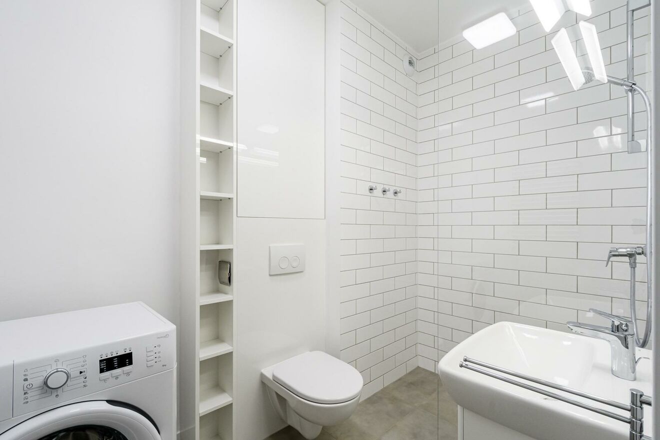 Łazienka jest wyposażona w WC, umywalkę, a także bezbrodzikowy prysznic oddzielony od pozostałej części pomieszczenia szklaną taflą. Nad umywalką zamontowane zostało lustro ścienne. W łazience, poza oświetleniem sufitowym, jest także lampa wisząca nad umywalką. Obok WC oraz pod umywalką zamontowane zostały szafki łazienkowe z drzwiami.
