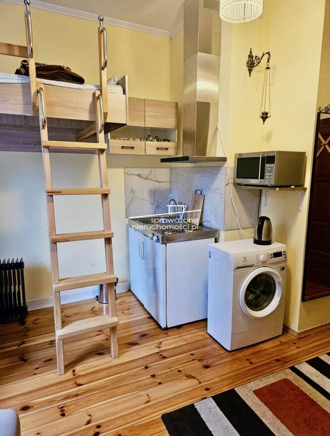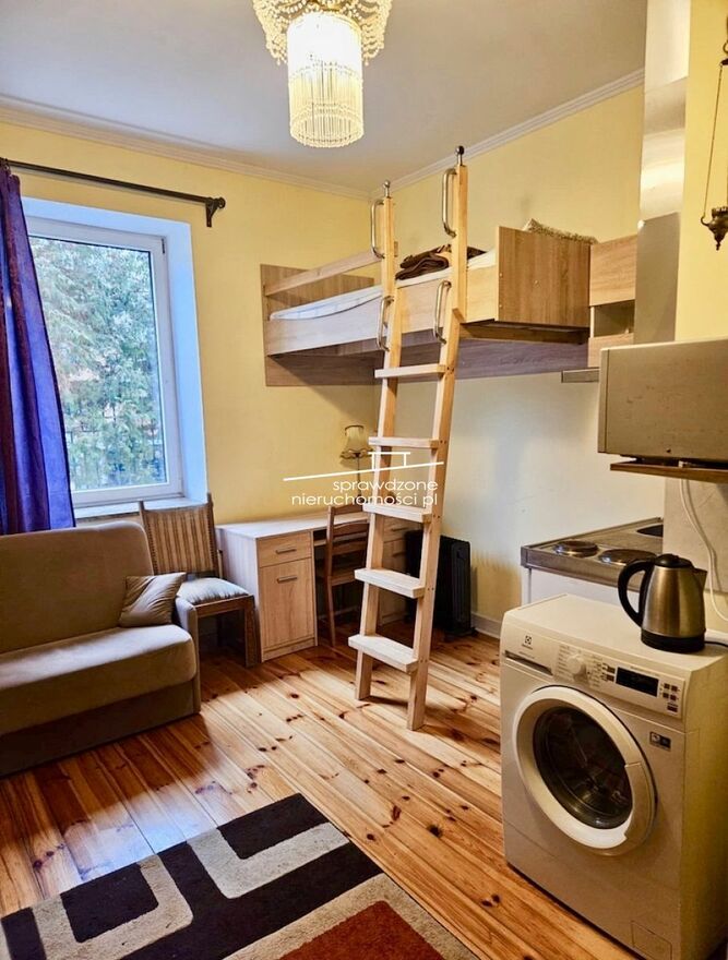 Mieszkanko jest w pełni wyposażone i umeblowane. Przytulnie urządzone, pomieści nawet 2 osoby (dwa miejsca do spania: łóżko na antresoli oraz rozkładana kanapa). Urządzony kącik kuchenny, jadalniany, wypoczynkowy oraz miejsce do pracy (biurko).