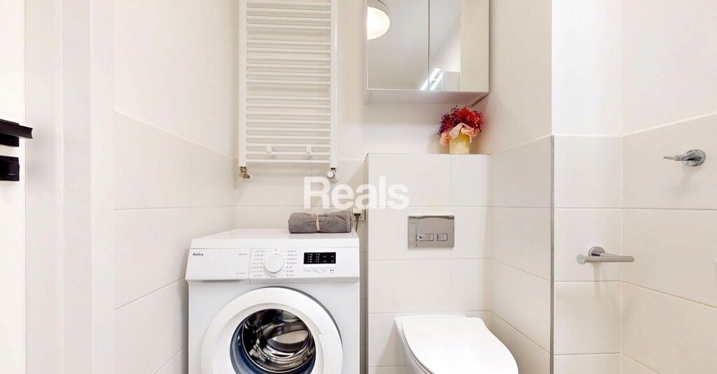- Łazienka z prysznicem, pralką, WC, umywalką oraz lustrem
