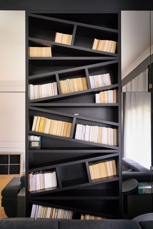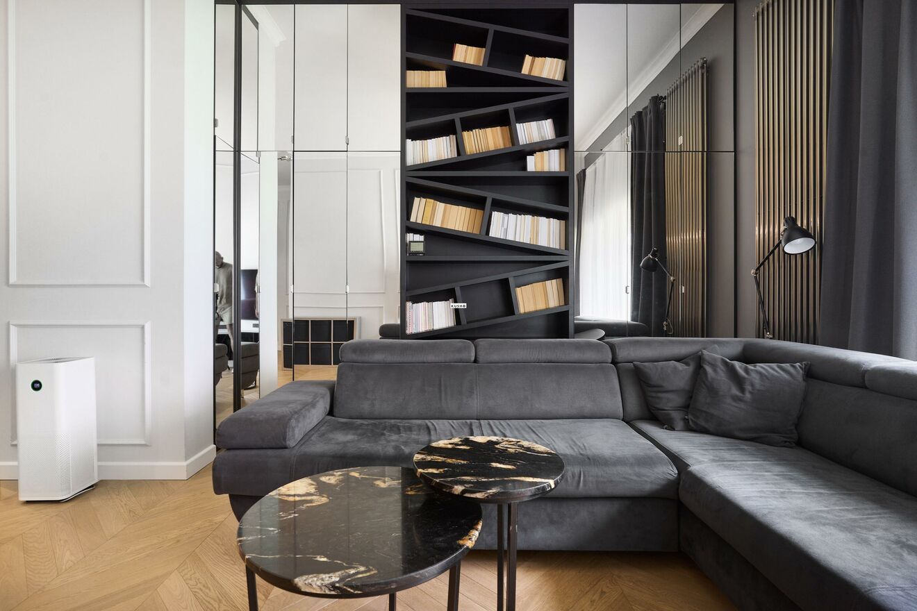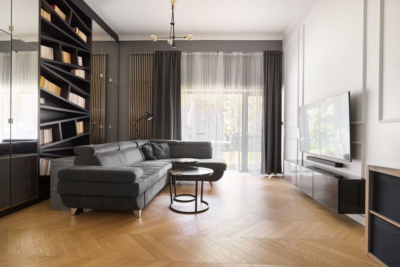 Floor-to-ceiling built-in wardrobes Bedroom and living room fully furnished with style-matched pieces Natural oak floors Grey Shadow (Kaczkan), oiled finish