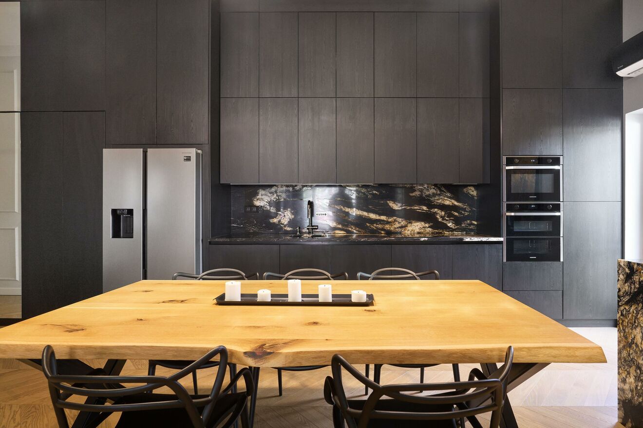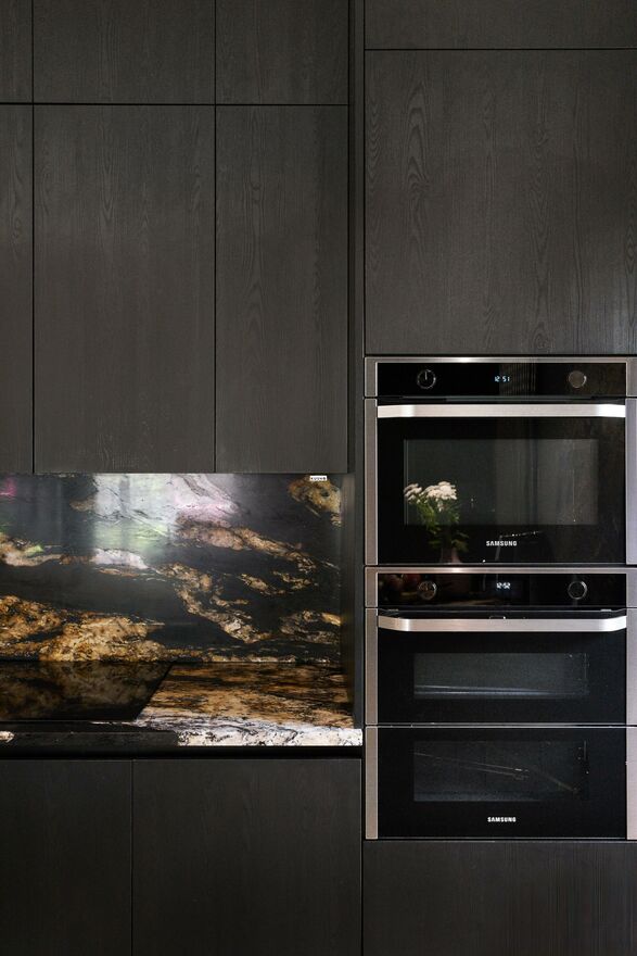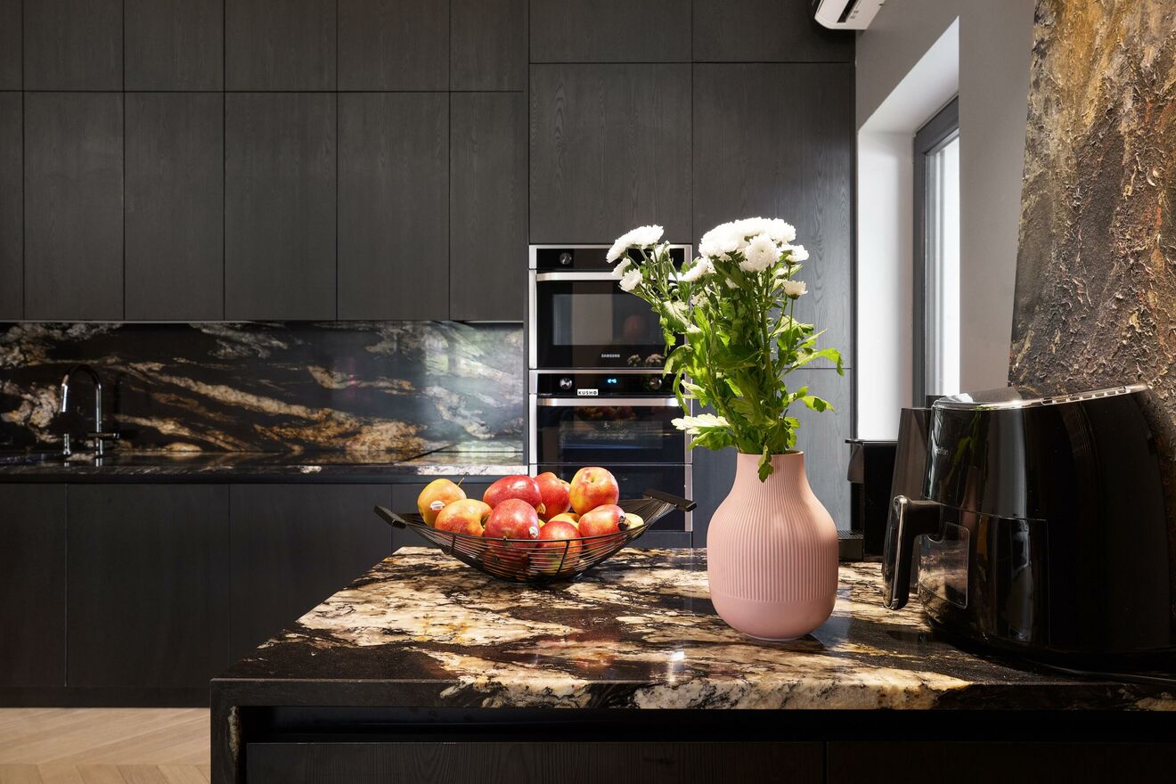 Brazilian granite countertops, backsplash, and peninsula Matching coffee tables made of the same stone Oak dining table (23 m), natural, oiled Custom cabinetry + high-end appliances: Samsung Side-by-Side fridge with ice maker & cold water (connected to waterline) Samsung Dual Cook oven + additional convection oven/microwave Samsung induction cooktop, dishwasher (60 cm), hood LG washer-dryer hidden in cabinetry