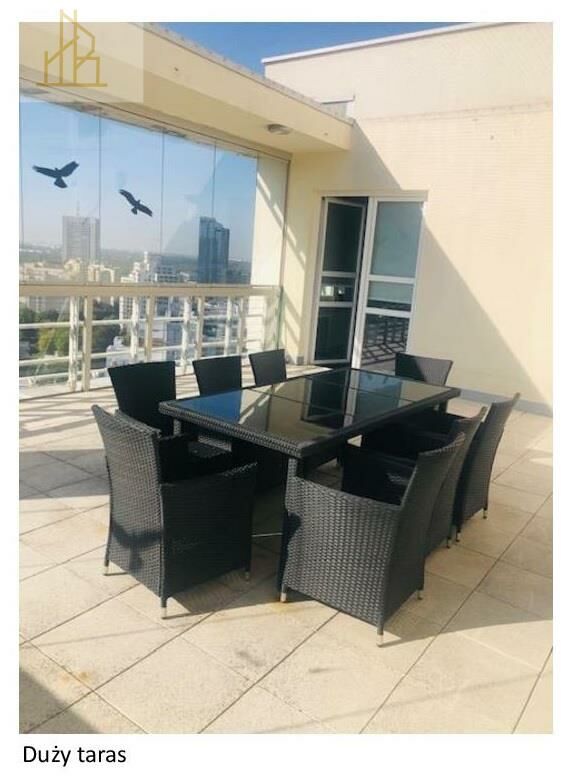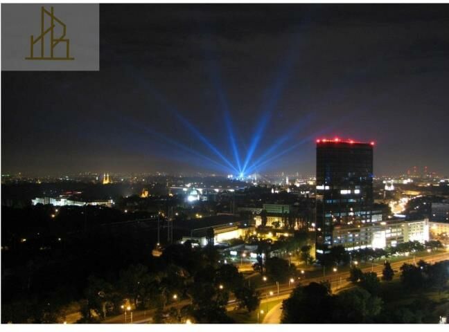 XXII (ostatnie) piętro, salon połączony z kuchnią, oszklony balkon, sypialnia, gabinet, hol, dwie łazienki (jedna z wanną, druga z kabiną).