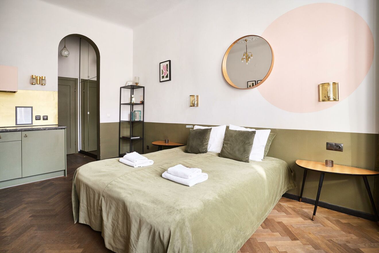 Dwa apartamenty typu studio doskonałe dla par lub osób podróżujących służbowo. Jeden apartament z osobną sypialnią, salonem połączonym z aneksem kuchennym oraz wyjściem na kameralny balkon.