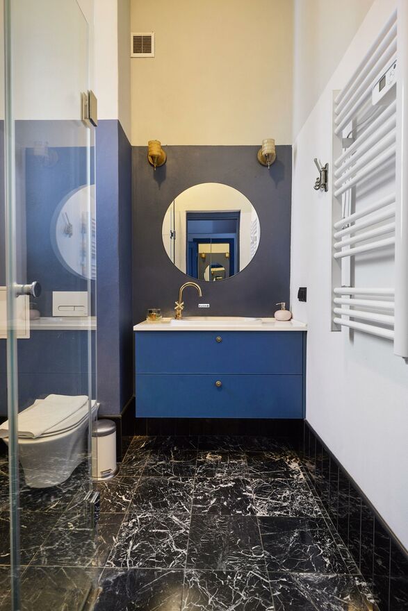 Each apartment is equipped with: A dishwasher, induction hob, coffee maker and TV with Wi-Fi. Bathrooms with elegant Eramosa Jade marble tiles. A kitchen with brass accents, including sheet metal, which has been restored from pre-war materials. The floors in all rooms, except the bathrooms, are original, renovated and oiled parquet, which gives the interiors warmth and class.