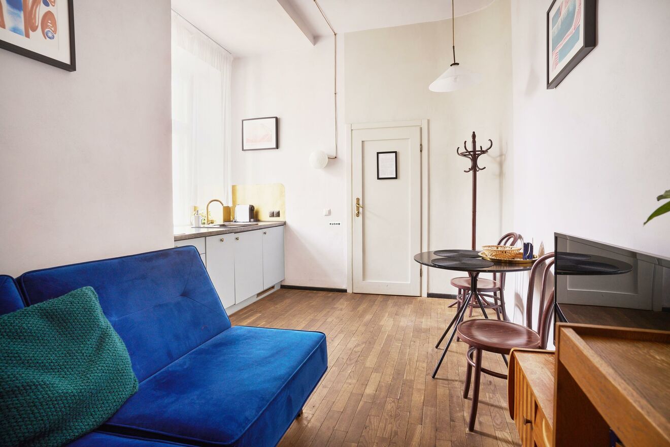 Property description: The apartment is located on the first of five floors of a historic tenement house from 1908, designed by Kazimierz Meyet. The 3.30-meter-high interior has been divided into three independent apartments: Two studio apartments, perfect for couples or business travelers. One apartment with a separate bedroom, a living room with a kitchenette and access to a cozy balcony.