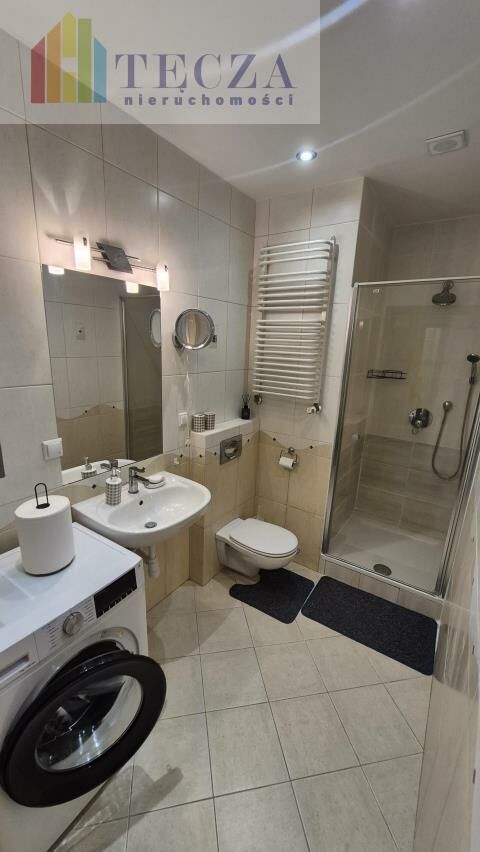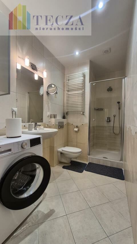 * łazienka z kabiną prysznicową, pralką, umywalką, wc,
