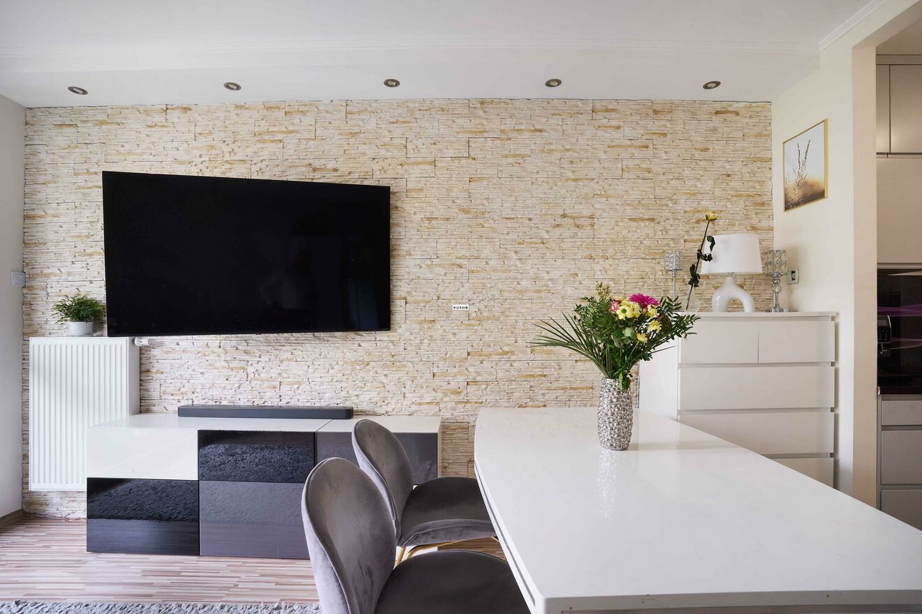 All appliances are built-in, emphasizing the clean and modern design. Cozy bedroom where you can unwind after a busy day. Wooden windows bring in plenty of natural light, while the panels and smooth walls add warmth and a pleasant energy.Furnishings can be adjusted to your preferences, ensuring you truly feel at home. Large windows guarantee peace and quiet, and friendly neighbors create a welcoming atmosphere throughout the area.
