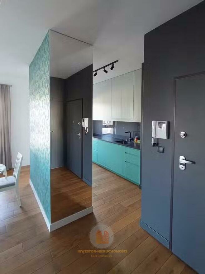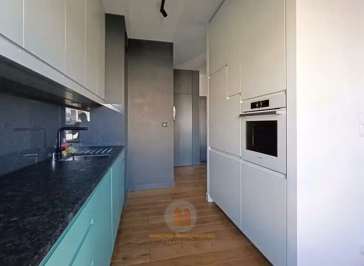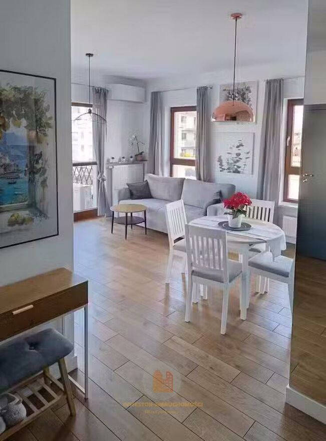 Na wyposażeniu: meble na wymiar, AGD (pralka, zmywarka, płyta grzewcza, piekarnik, lodówka), zainstalowana klimatyzacja, wideo domofon.