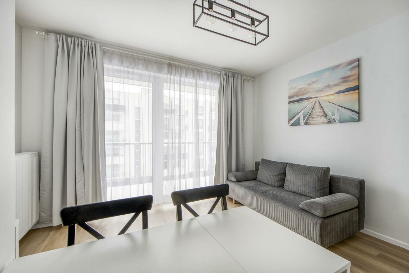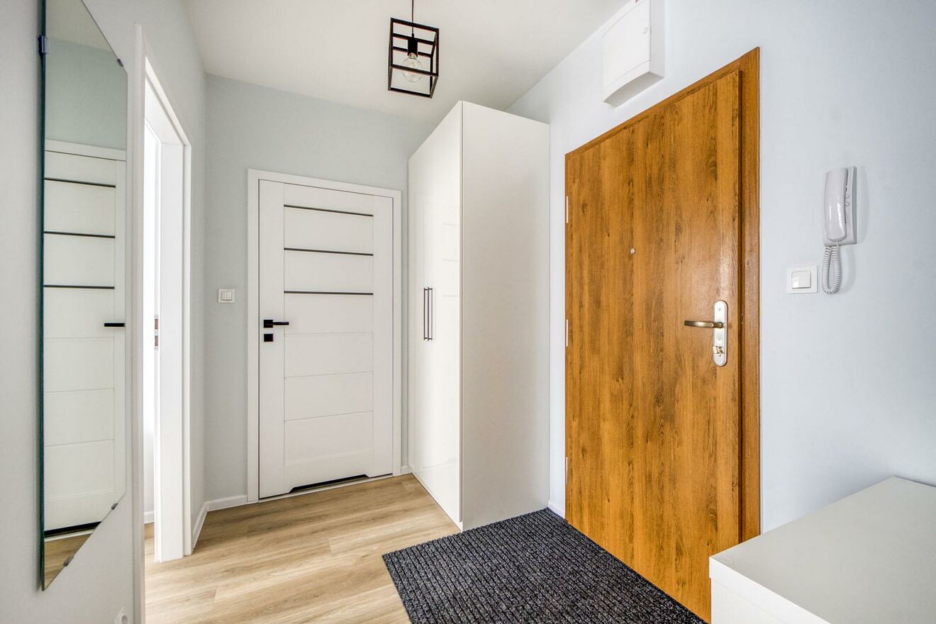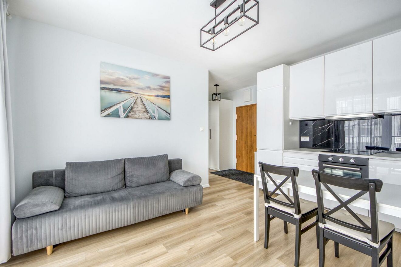 Do mieszkania wchodzi się przez przedpokój z szafą ubraniową. Salon z aneksem kuchennym wyposażonym w meble oraz urządzenia AGD w zabudowie: lodówkę z zamrażalnikiem, płytę elektryczną, piekarnik i zmywarkę. W salonie znajdują się kanapa z funkcją spania, stół z krzesłami oraz szafka.