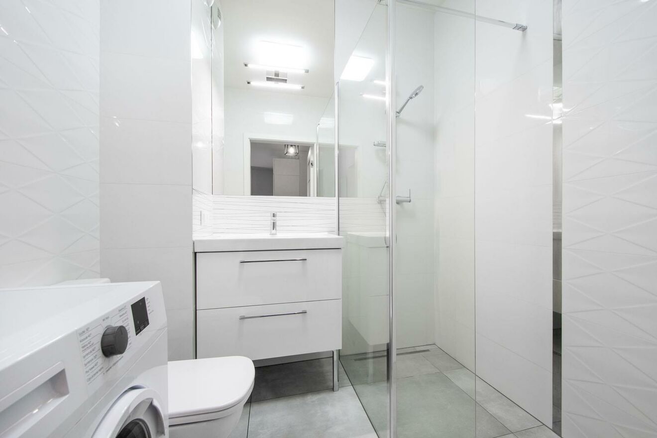 W sypialni znajdują się dwie pojemne szafy garderobiane, rama łózka wraz z materacem o szerokości 140 cm oraz dwie szafki nocne. W łazience z wydzieloną częścią prysznicową znajduje się pralka.