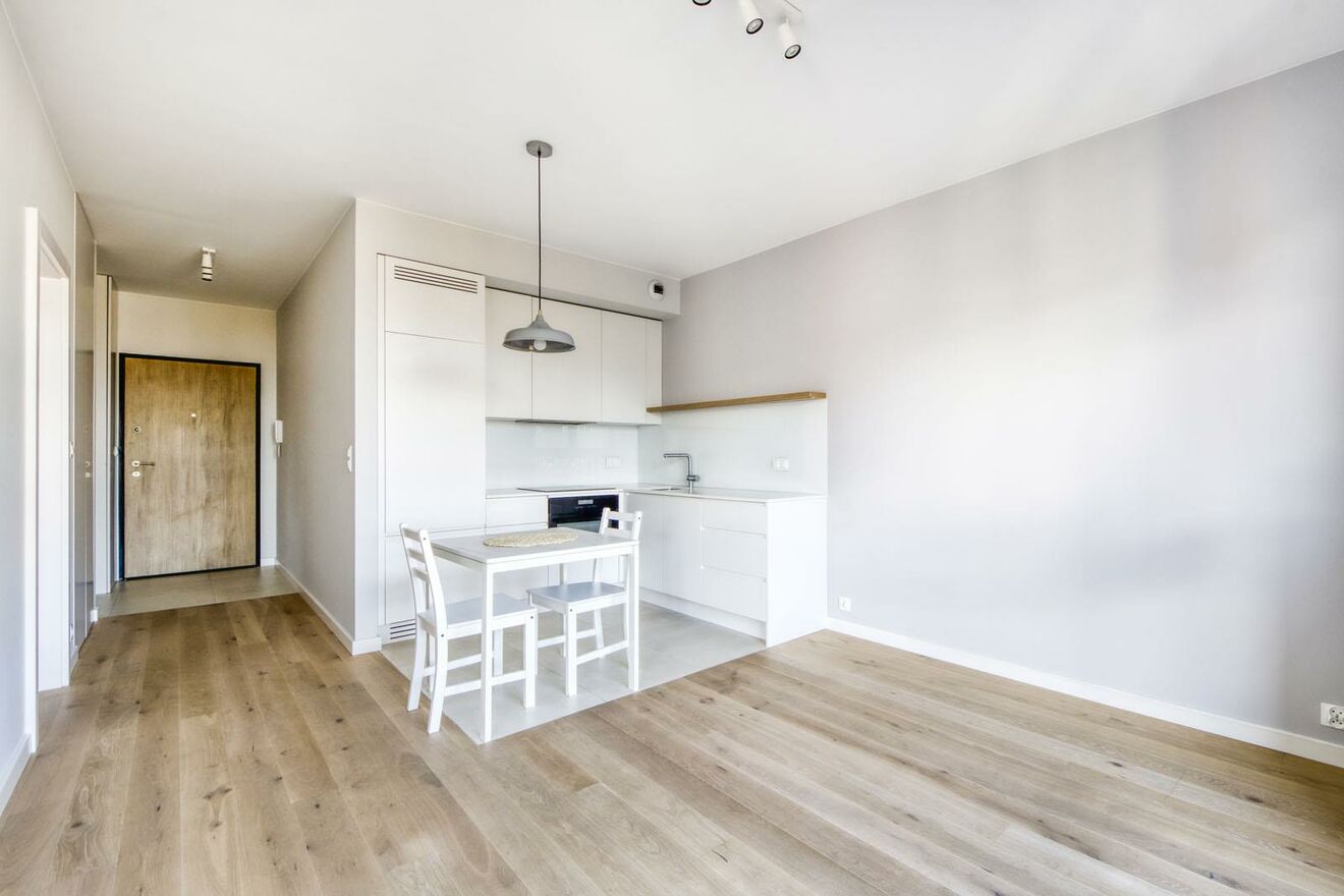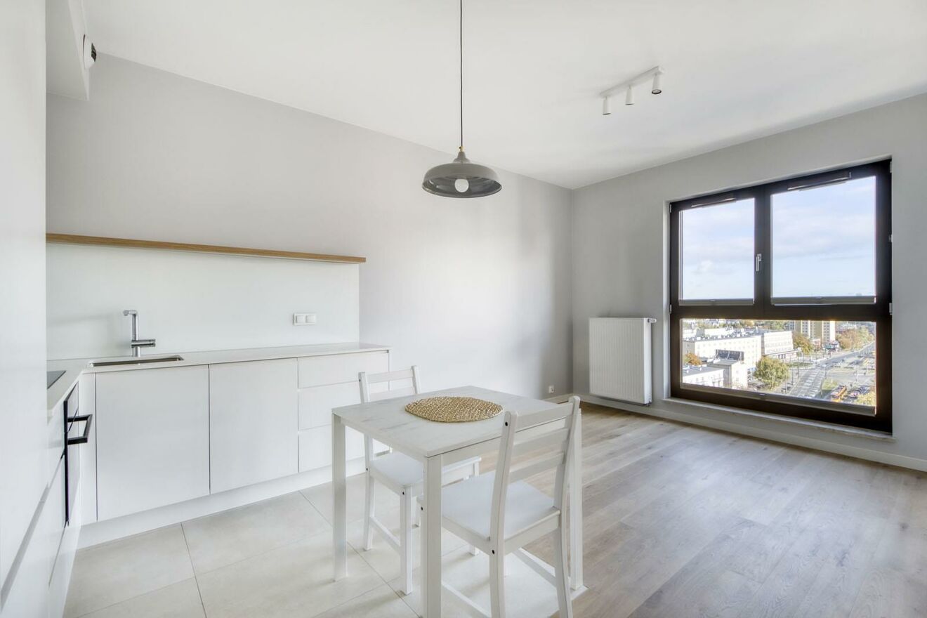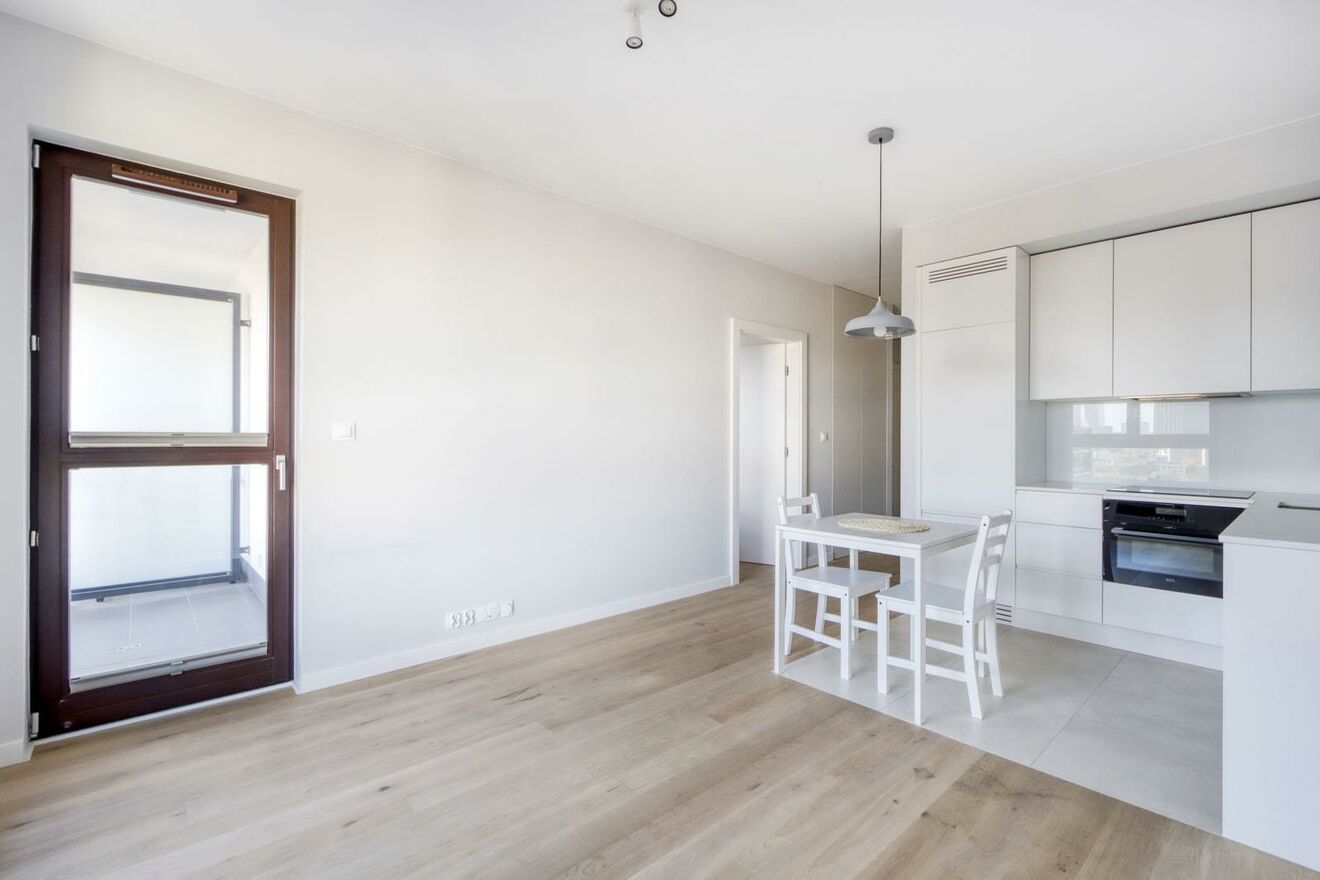 Centralnym punktem mieszkania o ekspozycji wschodniej jest salon z aneksem kuchennym w którym znajduje się wyjście na przestronną loggię z widokiem na panoramę Warszawy.