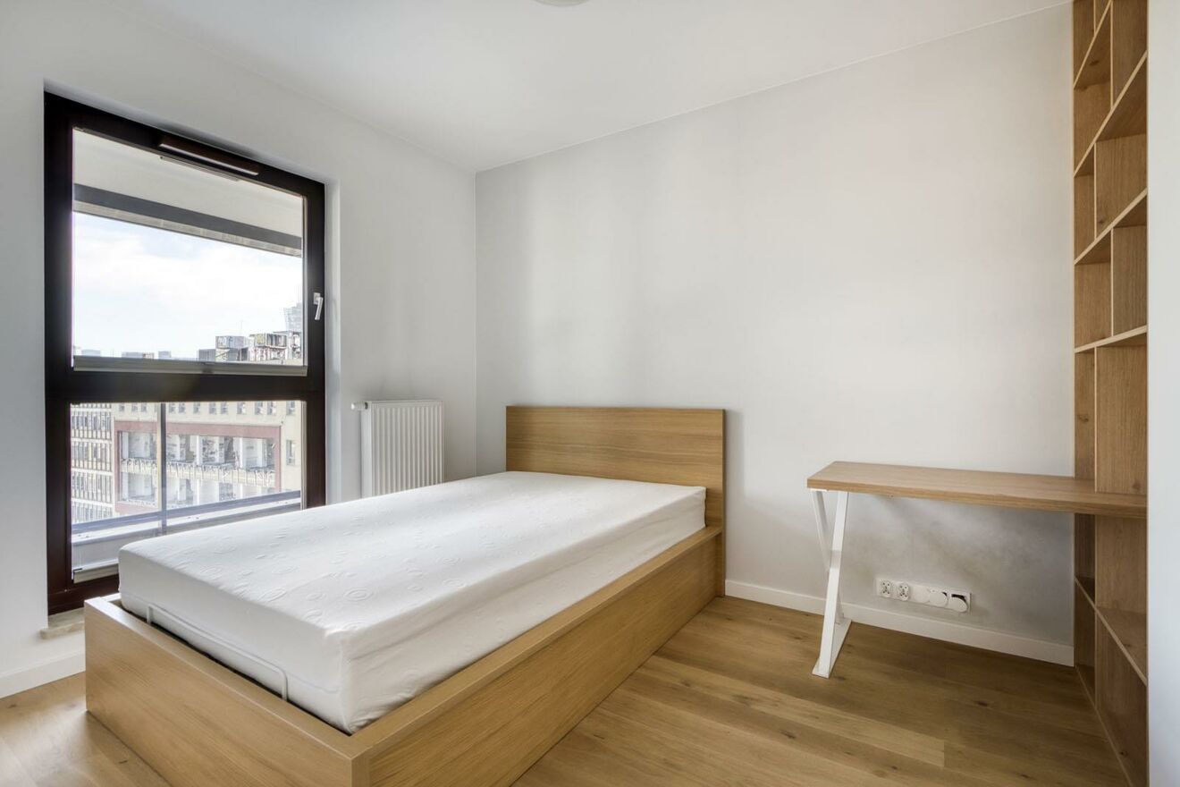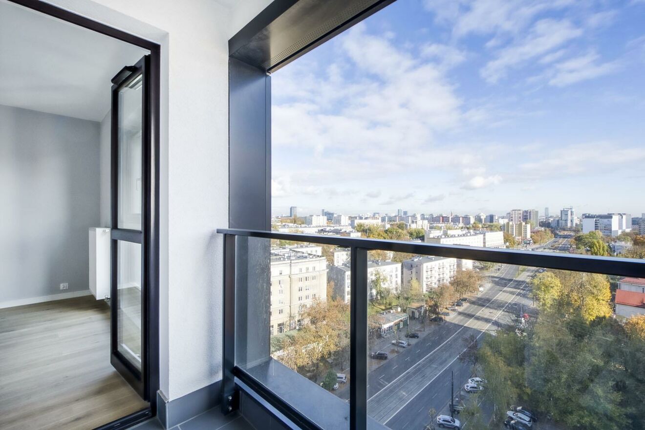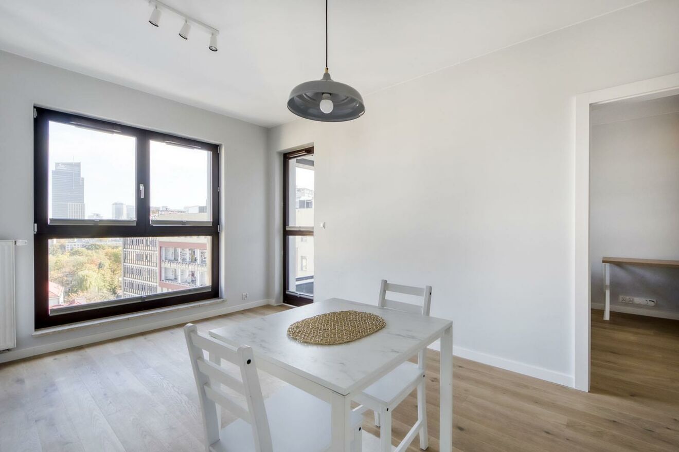 Centralnym punktem mieszkania o ekspozycji wschodniej jest salon z aneksem kuchennym w którym znajduje się wyjście na przestronną loggię z widokiem na panoramę Warszawy.