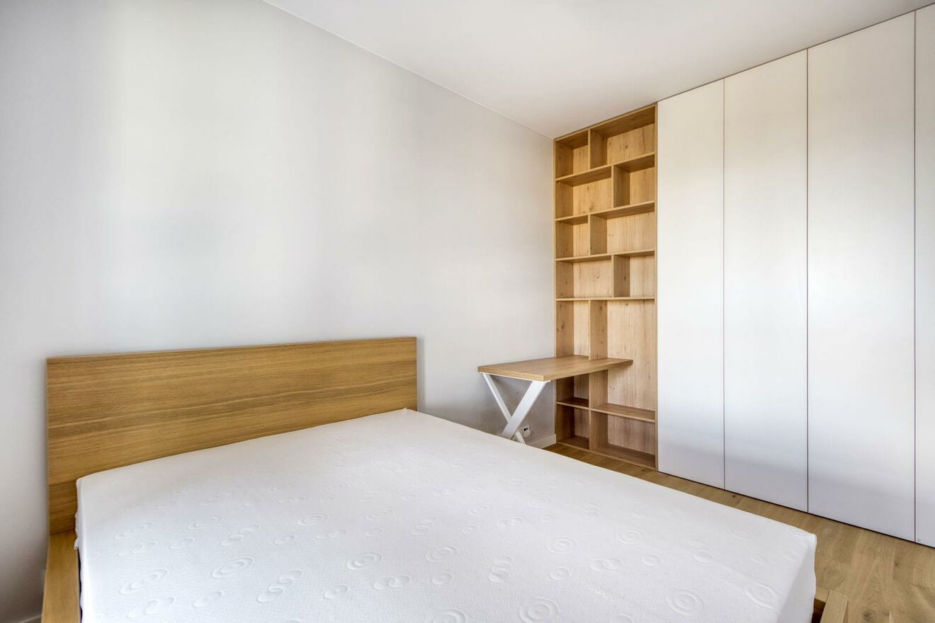 W sypialni znajduje się pojemna zabudowa stolarska, rama łóżka wraz z materacem oraz biurko.