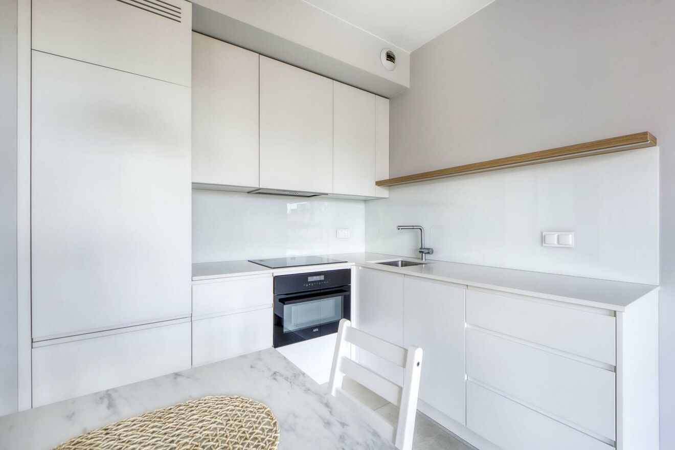 Aneks kuchenny wyposażony jest w urządzenia AGD w zabudowie: płytę indukcyjną, piekarnik, zmywarkę oraz lodówkę z zamrażalnikiem. Regularny kształt salonu pozwala na dowolne zaaranżowanie przestrzeni.