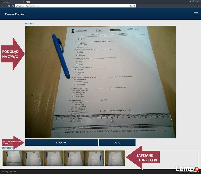 Kamera średnio co 3 sekundy przesyła zdjęcia na nasz serwer. Odczytu zdjęć można dokonać na stronie www.radio.specteam.pl po wpisaniu hasła. Wypożyczany zestaw jest od razu gotowy do pracy. Hasło do serwisu podajemy przy zakupie lub wynajmie urządzenia. Łączność głosowa odbywa się za pomocą telefonu komórkowego oraz mikrosłuchawki.