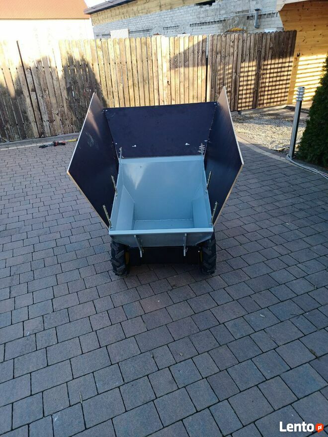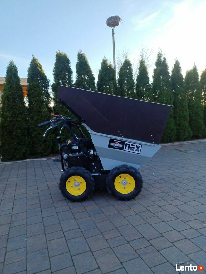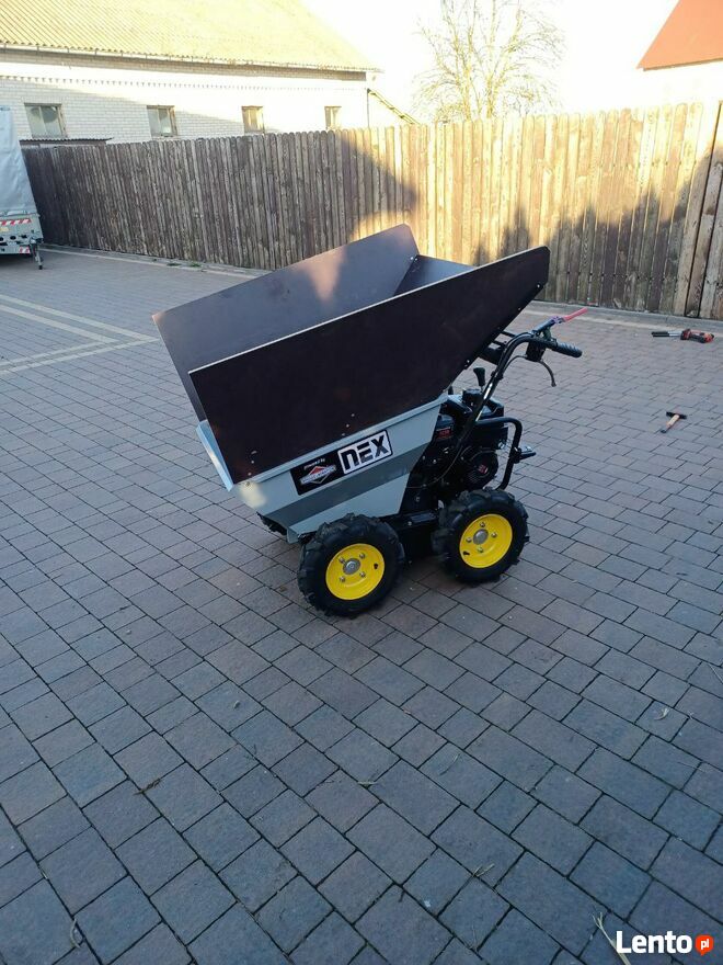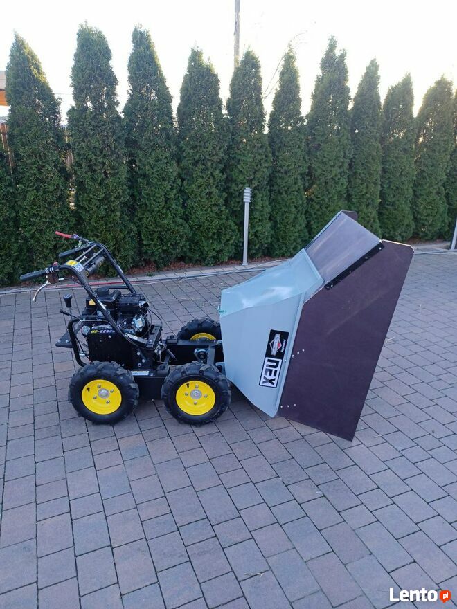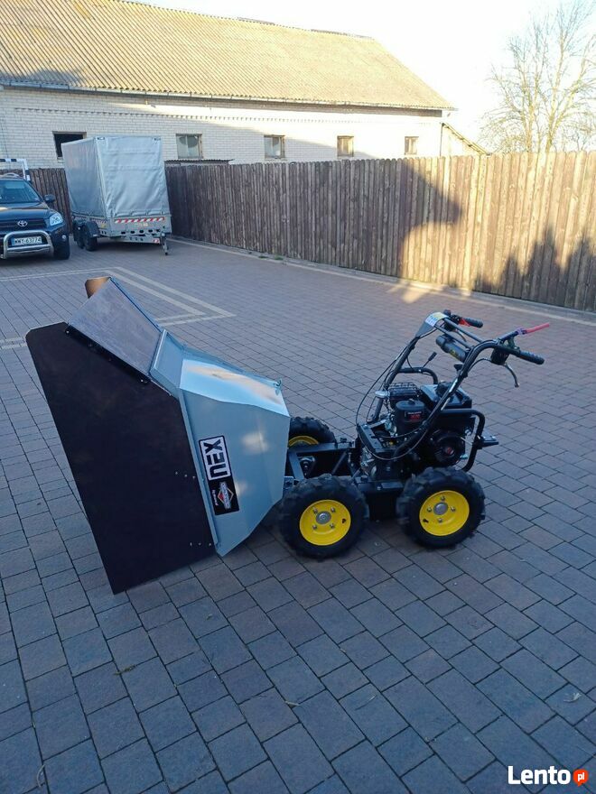 Sprzedam wozidło budowlane ogrodowe spalinowe z silnikiem brigstraton i napędem 4x4. Silnik pali od strzała z rozrusznika jak i z szarpaka biegi 3+R płynna jazda oraz skręcanie za pomocą dźwigni nie wymaga żadnej siły operatora nawet przy maksymalnym obciążeniu które wynosi 350kg. Można załadować sporo więcej bo radzi sobie świetnie nawet w błocie. Wozidło wyposażone dodatkowo w oświetlenie robocze, nadstawki skrzyni które zwiększają objętość,pług do śniegu lub ziemi,platformę do przewozu drewna i długich elementów a także w hak który umożliwia z łatwością przestawić przyczepkę... wozidło zakupione rok temu i nigdy nie używane w budowlance. Używane tylko koło domu(trawa, gałęzie, i ogólnie na podwórku) od nowości wypaliło ok 10l paliwa. Więc tak naprawdę silnik jest tylko co dotarty. Sprzedaje z całym wyposażeniem .Zapraszam do obejrzenia i zakupu.