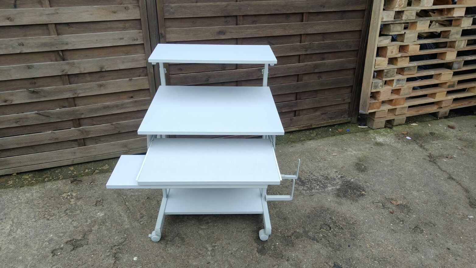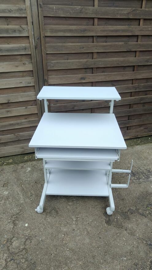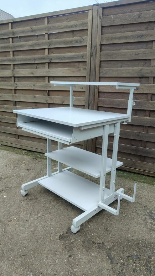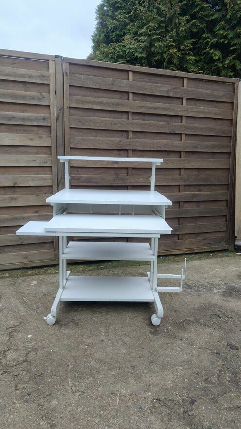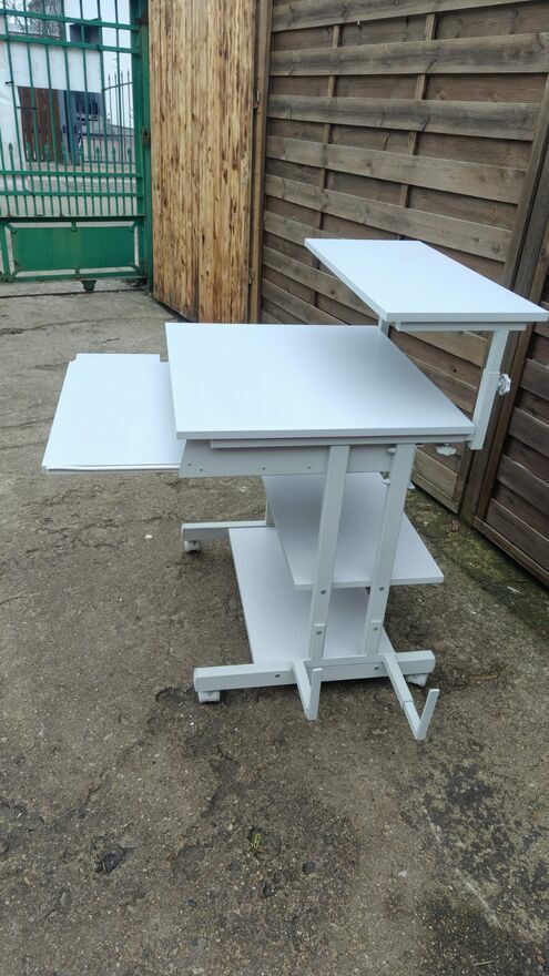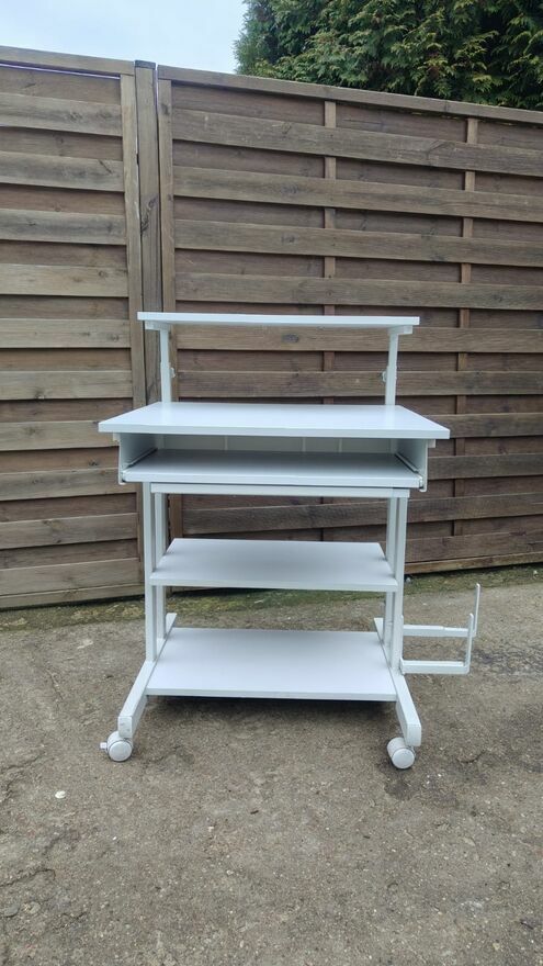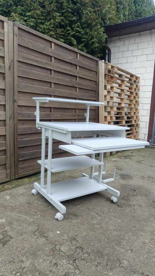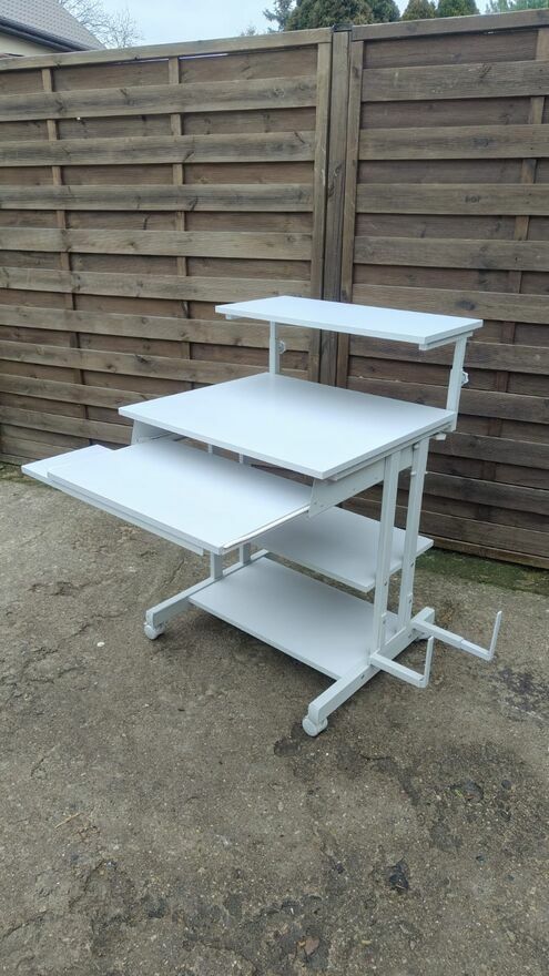 Sprzedam mobilne biurko / stolik komputerowy na kółkach. Regulowana wysokość blatu górnego oraz szerokość.Kolor szary. Doskonały do biura, małych pomieszczeń lub gabinetu lekarskiego na ultrasonograf.Wymiary: