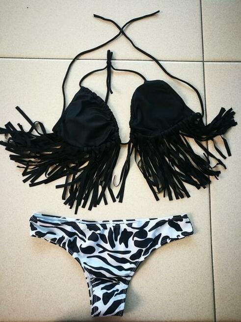 3 3 kostium kąpielowy dwuczęściowy bikini frędzle czarno-biały L Witam