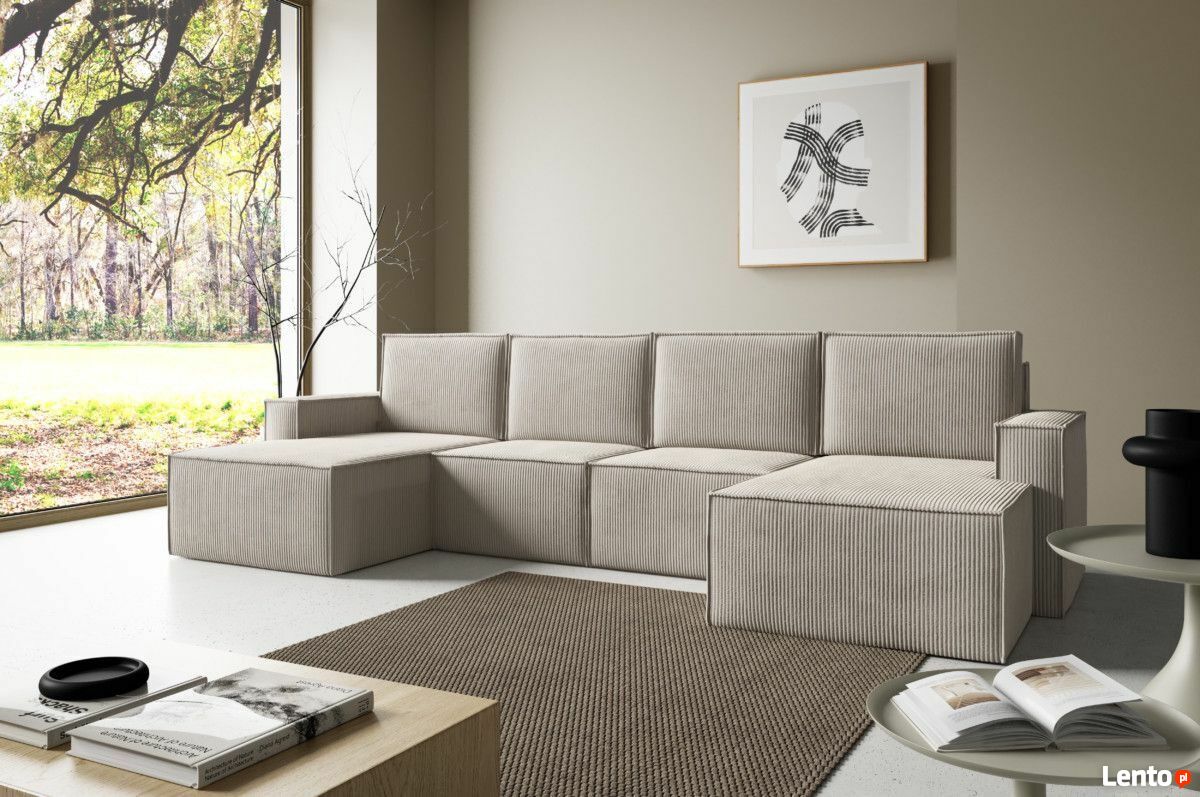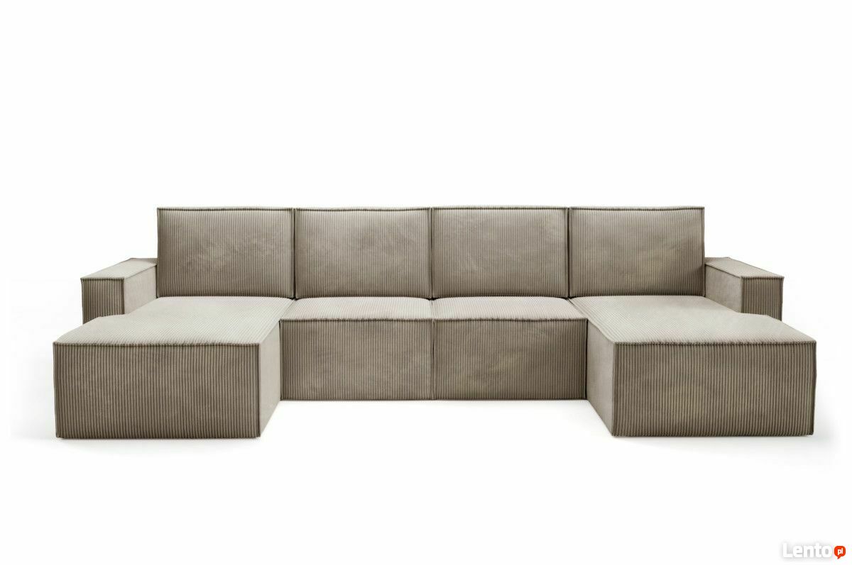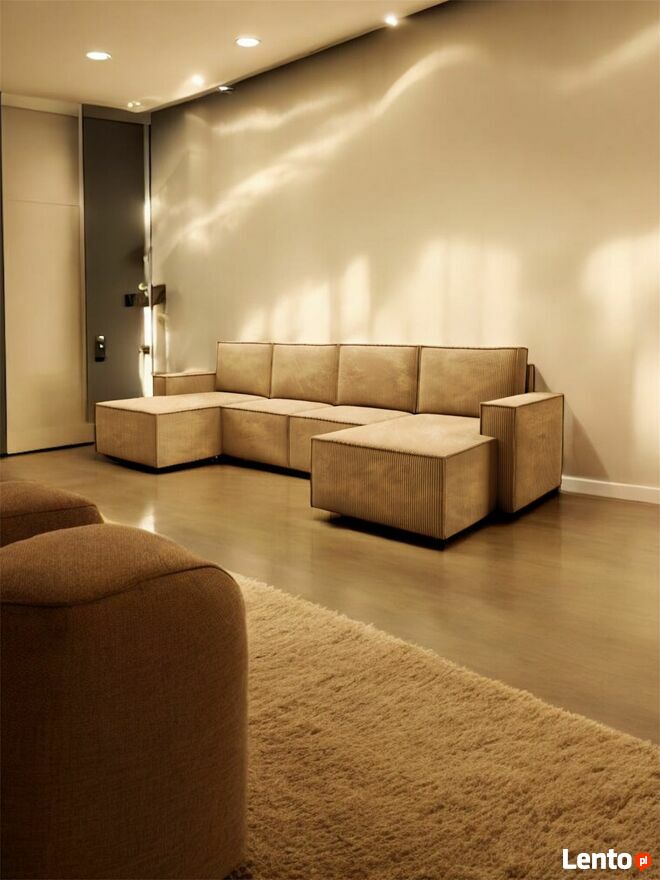 Oferuję elegancką, modułową sofę narożną o geometrycznym designie, idealną do nowoczesnych wnętrz. Materiał to miękki welur z delikatnym prążkowanym wzorem – trwały i łatwy w utrzymaniu czystości.Najważniejsze cechy: