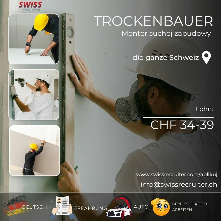 SWISS RECRUITER SP. Z O.O. (KRAZ. 26036) - Jesteśmy wiodącą firmą która prowadzi rekrutacje dla największych Szwajcarskich firm z sektora budowlanego.Zatrudnienie odbywa się bezpośrednio przez Szwajcarską firmę z pełną Szwajcarską umową o pracę. Dzięki dużemu doświadczeniu Tylko na rynku Szwajcarskim pomożemy Tobie szybko uzyskać pracę na obecnie najlepszym rynku pracy w Europie!