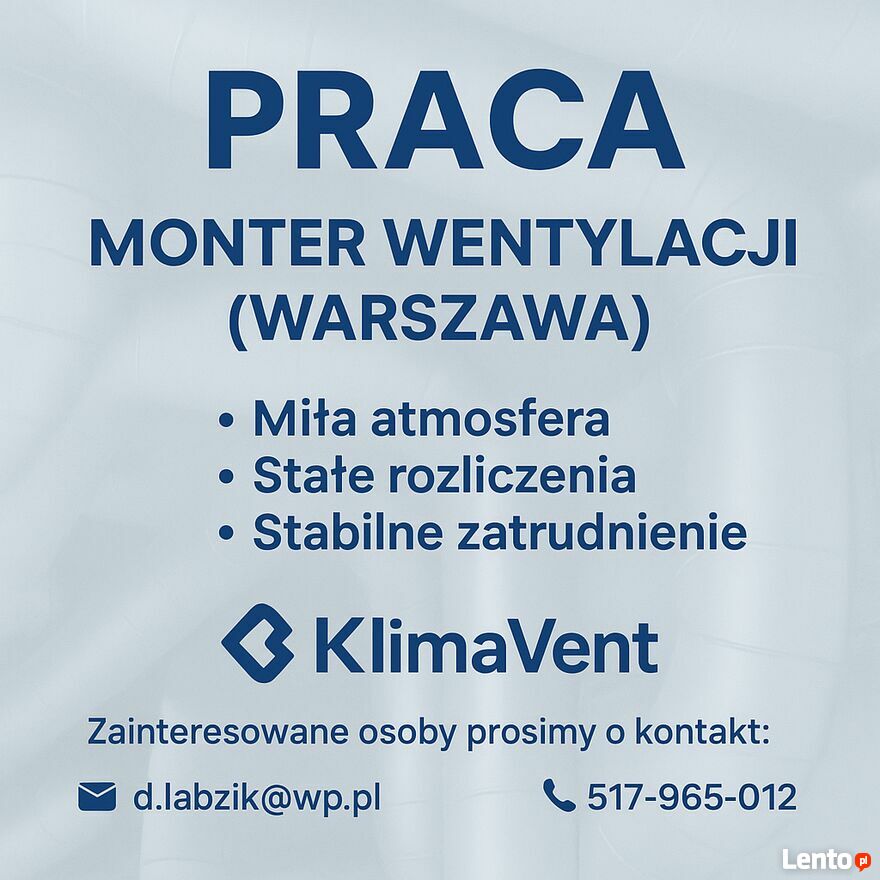 Firma KlimaVent poszukuje pracownika fizycznegoMiejsce pracy: Warszawa
