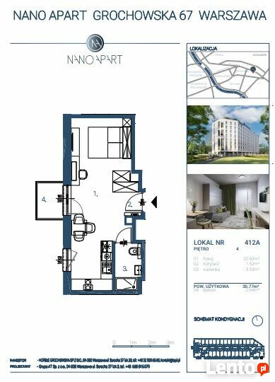 Na sprzedaż w pełni wykończony i wyposażony lokal użytkowy o powierzchni 30,77 m² z balkonem o pow. 2,64 m², usytuowany na 4 piętrze zlokalizowany w nowoczesnym 7- piętrowym kompleksie przy ul. Grochowskiej 67 w Warszawie. Lokal urządzony w standardzie hotelowym 4★ – gotowy do natychmiastowego najmu lub zamieszkania.