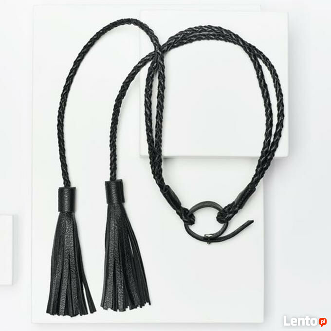 Naszyjnik wykonany jest ze splecionych pasów skóry zakończonych długimi frędzlami oraz skórzanego zapięcia .